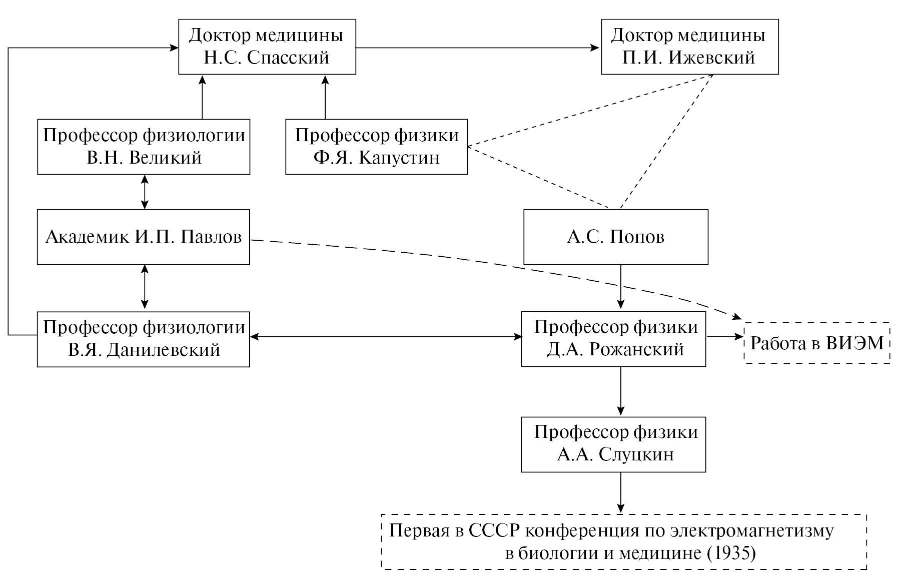 Рис. 1. Научные контакты и преемственность первых исследователей биомедицинских эффектов электромагнетизма в Российской Империи [6].