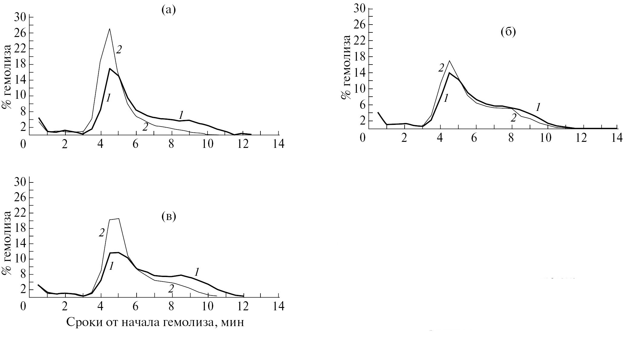 Дифференциальные эритрограммы стрессированных животных (рис. 1, а) показывают, что гемолитическая устойчивость их эритроцитов падает: уменьшается время гемолиза, эритрограммы смещаются влево, растет высота пика за счет уменьшения в крови объема фракции устойчивых к действию гемолитика эритроцитов (правое крыло эритрограмм опускается).
