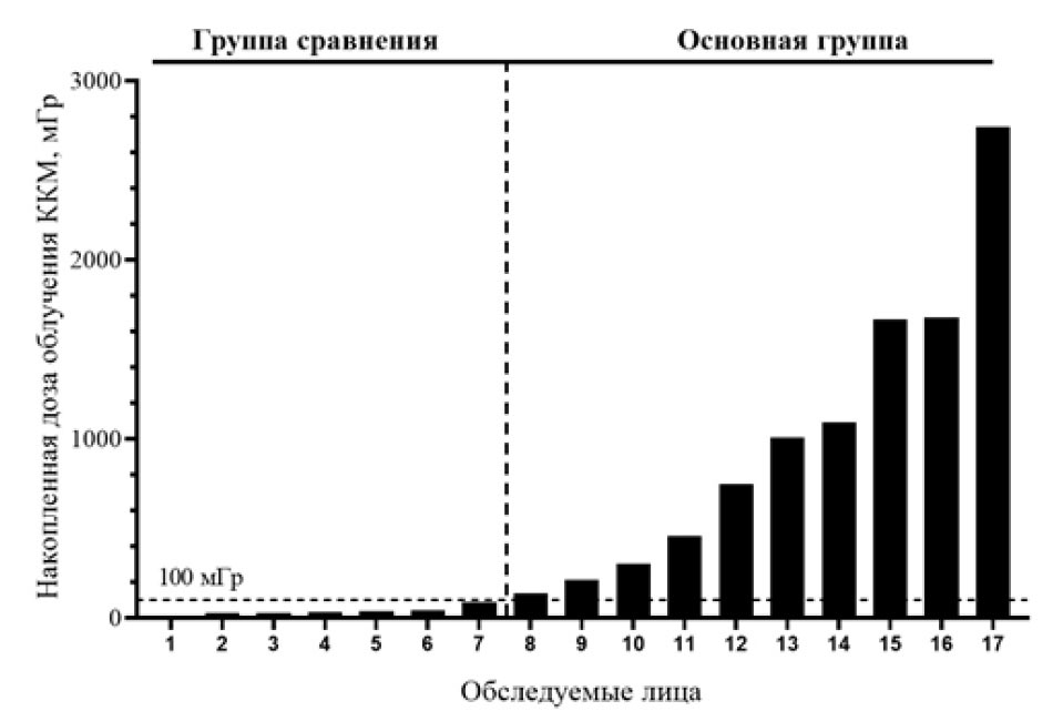 В основную группу вошли 10 женщин с накопленными дозами облучения ККМ от 135.8 до 2742.0 мГр (среднее значение – 1003.9 ± 261.5 мГр). В группу сравнения были включены семь женщин из КРТ, чьи дозы облучения ККМ не превышали 100 мГр (среднее значение накопленной поглощенной дозы в этой группе составило – 36,1 ± 9.7 мГр).