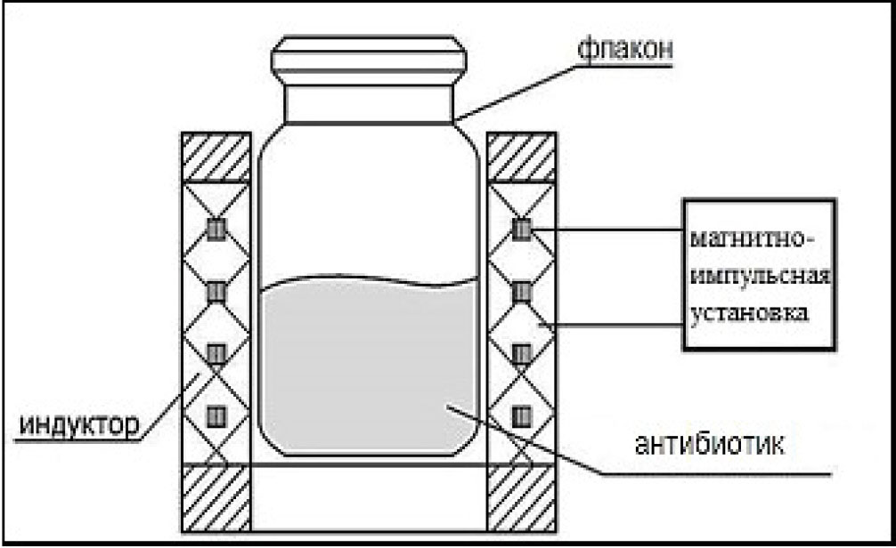 На рис. 1 представлена схема воздействия ИМП на β-лактамный антибиотик: магнитное поле свободно проходит через стенку стеклянного флакона и воздействует на лекарственный препарат [8].