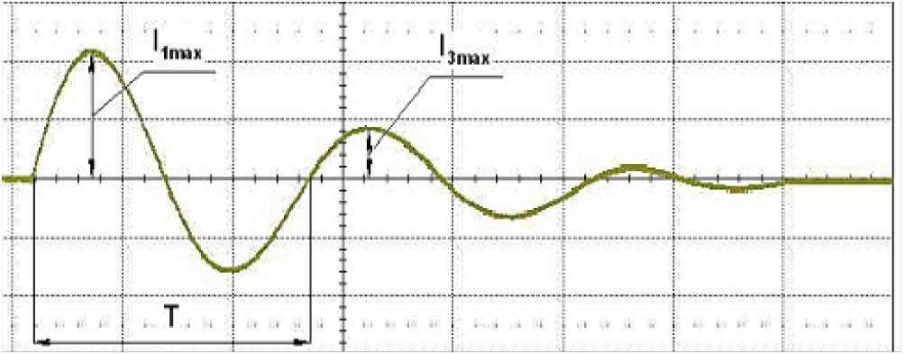 Fig. 2. Shape of the discharge current in the inductor, which is a damped sinusoid: I1max – amplitude of the 1st half-period of current, I3max – amplitude of the 3rd half-period of current, T – oscillation period.