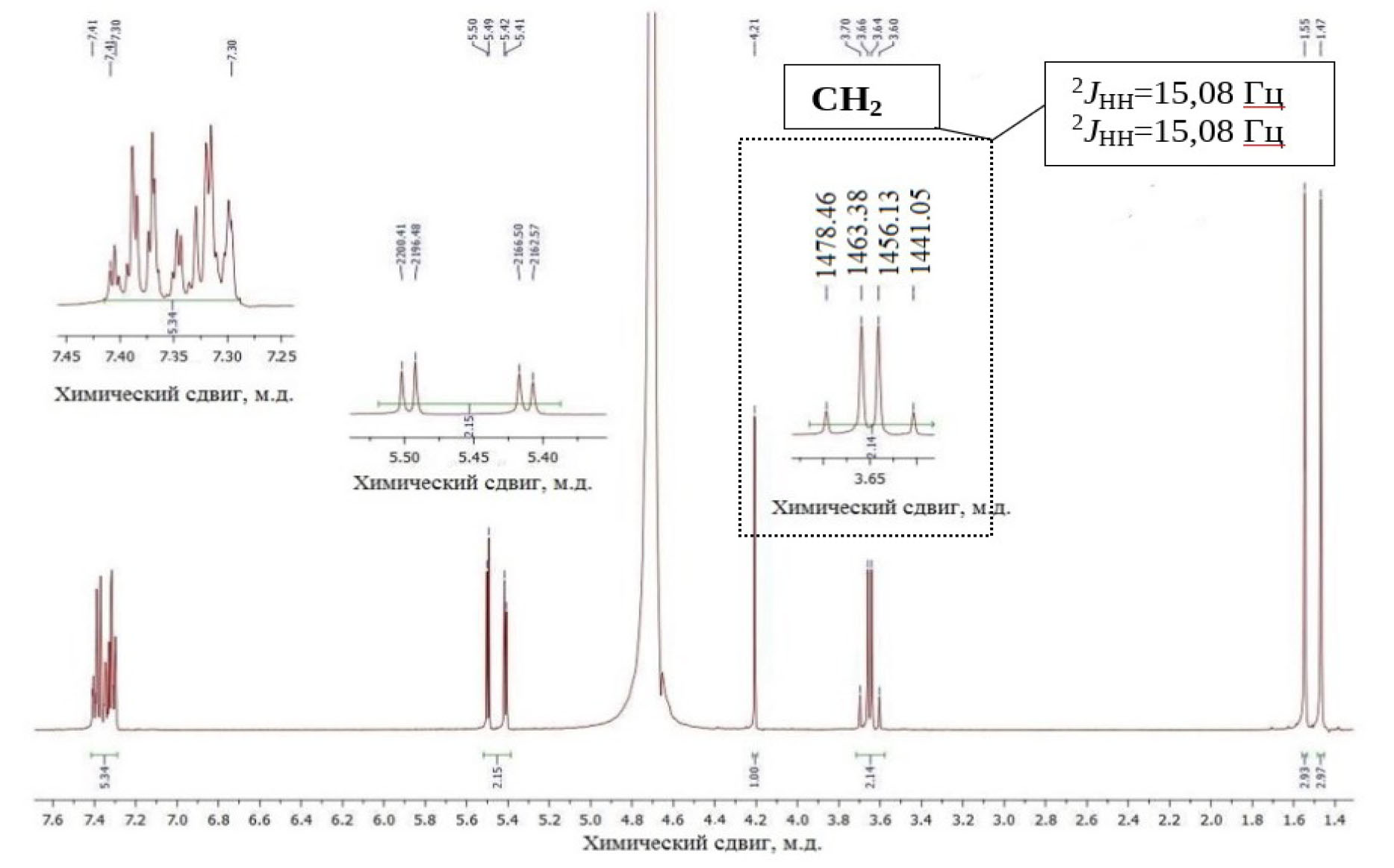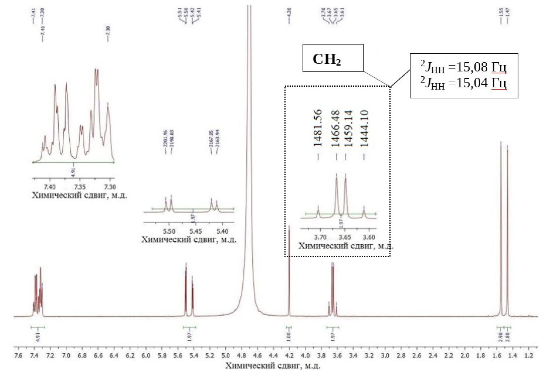 Обработка магнитным полем с напряженностью Н = 0,64 × 106 А/м привела к изменению одной из КССВ (2 JНН = 15,08 Гц и 2JНН = 15,04 Гц), как следует из данных спектра ЯМР 1Н (рис. 4).