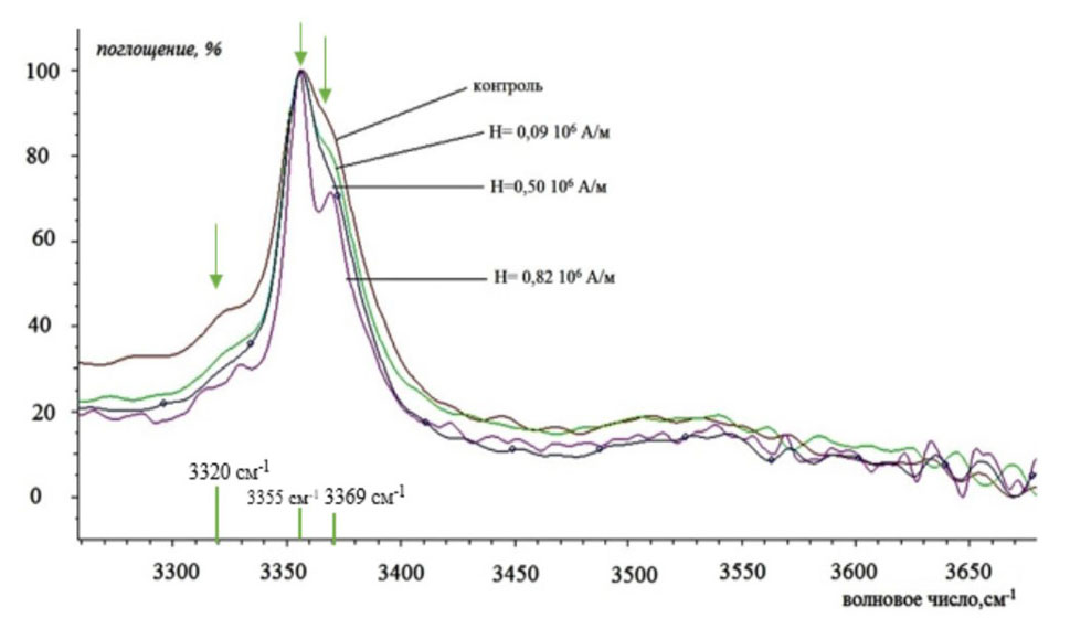 Методом ИК-спектроскопии зафиксировано, что увеличение интенсивности магнитного поля при воздействии с напряженностями в диапазоне Н = (0,09÷0,82) × 106 А/м на бензилпенициллина натриевую соль приводит к уменьшению интенсивности полосы поглощения при 3320 см⁻¹ и разрешению полос при 3355 см⁻¹ и 3369 см⁻¹, которые относятся к валентным колебаниям связи N–H (рис. 5, табл. 1).