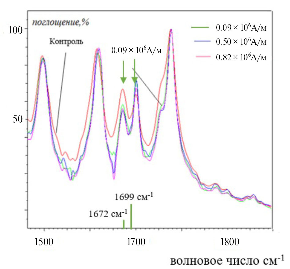 Полоса, см⁻¹ | Контроль | Обработка при напряженности H = 0.09 × 106 А/м | Обработка при напряженности Н = 0.50 × 106 А/м | Обработка п ри напряженности Н = 0.82 × 106А/м |