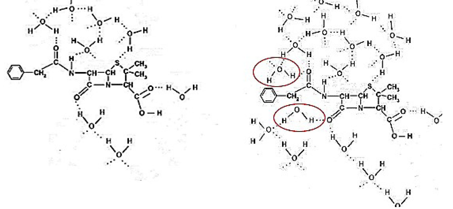 Fig. 7. Hydration of benzylpenicillin sodium salt molecule before (a) and after exposure (b) to pulsed magnetic field.