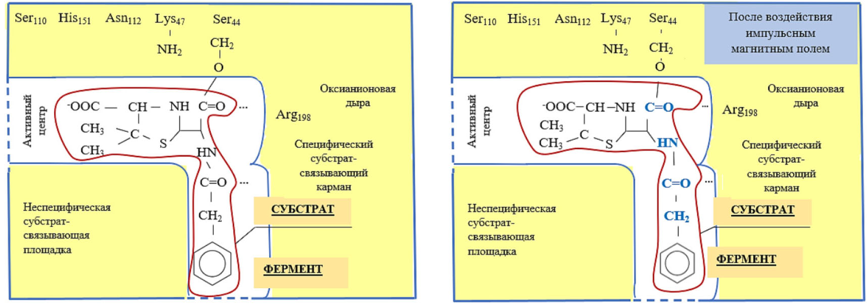Рис. 8. Предполагаемый механизм взаимодействия молекулы бензилпенициллна натриевой соли с пенициллин-связывающим белком PBP5 E.coli до и после воздействия импульсного магнитного поля.