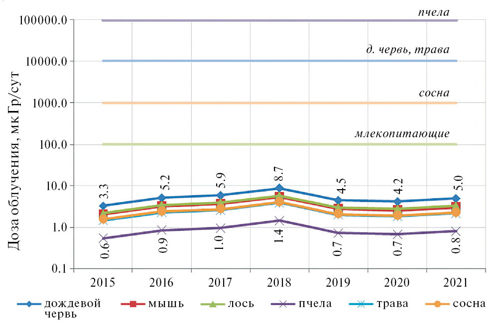 Дозовые нагрузки на объекты биоты изменяются от 0.5 мкГр/сут (для пчелы в 2015 г.) до 8.7 мкГр/сут (для дождевого червя в 2018 г.). В 2018 г. имеет место увеличение мощностей доз облучения всех видов биоты в связи с повышенными уровнями выброса ¹³¹I в атмосферу [16]. Наиболее подвержены радиационному воздействию в данной точке дождевой червь и млекопитающие. При этом полученные величины мощности дозы облучения биоты были значительно ниже пороговых уровней облучения ПДРН.