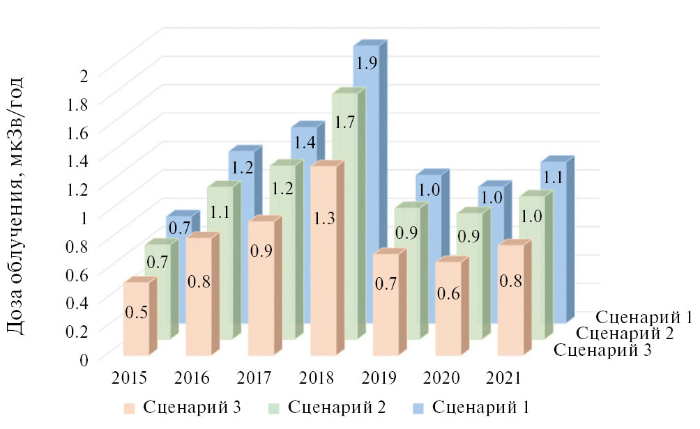 Наиболее реалистичны оценки для сценария 3, поскольку учитывают пребывание населения в нескольких точках местности в течение года, а также характеристики ведения хозяйственной деятельности, максимально приближенные к реальным событиям. Годовые дозы облучения населения от выбросов ¹³¹I НИФХИ для жителя г. Обнинска (в рамках сценария 3) варьировали от 0.5 до 1.3 мкЗв/год с максимумом в 2018 г. В период с 2019 по 2021 гг. отмечается резкое сокращение уровней облучения до уровней 2016 г. Такое изменение объясняется результатом ремонтных работ по усовершенствованию фильтрационных систем улавливания выбросов.