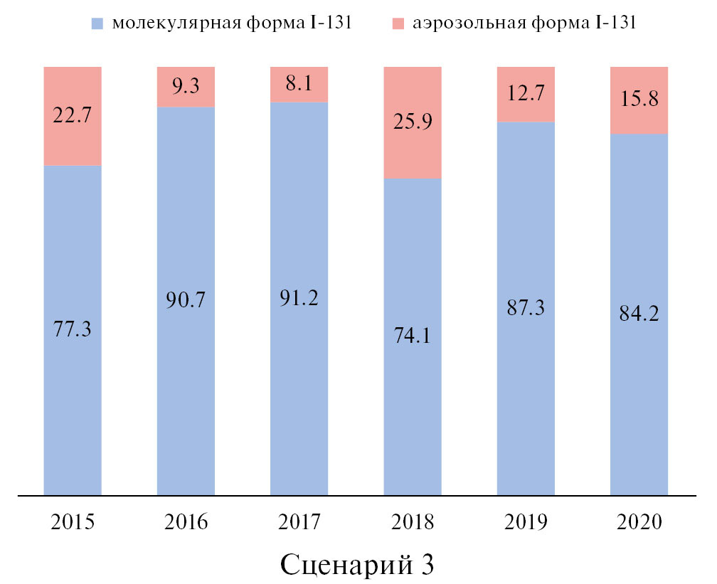 Преимущественный вклад в суммарную дозовую нагрузку вносит молекулярный йод. Вклад аэрозольной формы ¹³¹I для сценария 3 варьирует от 8.1 (в 2017 г.) до 25.9% (в 2018 году) (рис. 5). Наиболее высокие дозовые нагрузки от аэрозольной фракции в 2015 г. (22.7%) и 2018 году (25.9%) определяются высокими среднесуточными значениями объемной активности 0.11 и 0.25 Бк/м3 соответственно, что всего на один порядок ниже норматива допустимой СГОА ¹³¹I. Таким образом, в оценке важно учитывать две формы содержания ¹³¹I. Определяя дозу облучения с учетом только молекулярной фракции радионуклида, оценка может быть занижена, в данном случае — в 1.3 раза.
