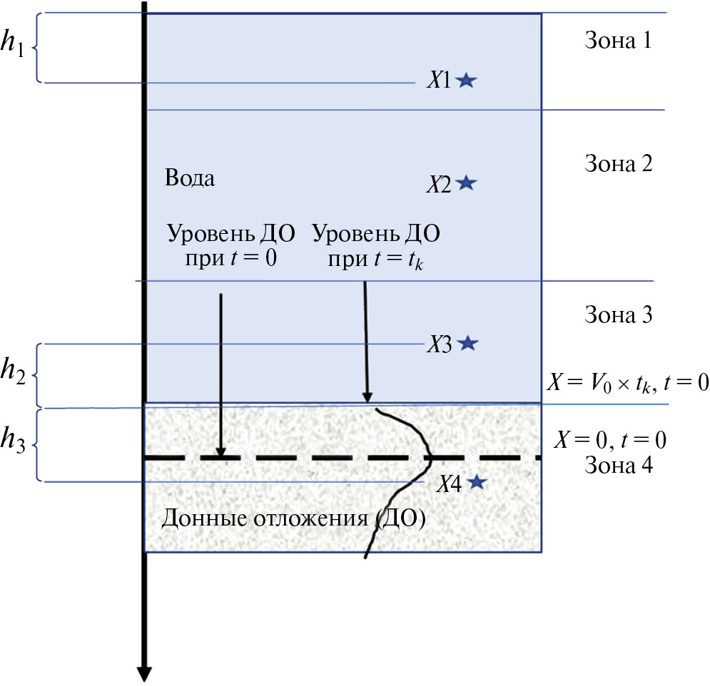 Fig. 1. To construction of the mathematical model of migration. Point “0” is at the boundary of water and bottom sediments at the moment of radionuclides entering the water body.