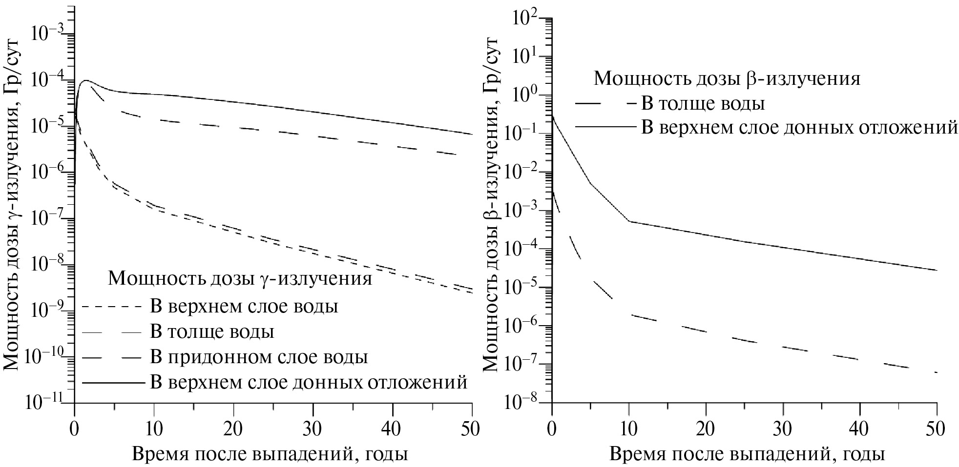В последующем вклад β-излучения снижается, причем динамика этого снижения определяется экологической нишей, занимаемой группой организмов. В наибольшей степени это выражено для донных организмов, что связано с различной проникающей способностью β- и γ-излучения, так как перераспределение радионуклидов в донных отложениях и вынос их из слоя, в котором обитает макрозообентос, в большей степени сказывается на дозах β-излучения. Этот эффект, хотя и в меньшей степени, сказывается на дозах облучения придонных видов рыбы, и практически на сказывается на дозах облучения организмов, обитающих в верхних слоях воды – фитопланктоне, зоопланктоне и некоторых видах рыб.