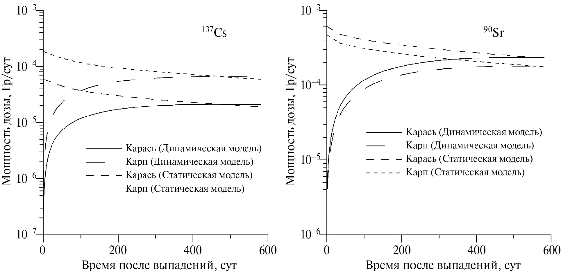 В первый период после загрязнения водоема максимальные дозы облучения (2.6–8.3 Гр/сут) отмечались для бентосных организмов, несколько меньшие дозы (до 3.3 Гр/сут) были характерны для зоопланктона. Минимальные дозы на протяжении первых 100 дней после загрязнения (до 4 мГр/сут) получали рыбы. Фитопланктон (дозы до 0.5 Гр/сут) в этом ряду занимает промежуточное положение. Дозы облучения рыбы достигают максимума (14–31 мГр/сут) через 100–150 дней после выпадений, снижаясь до 8.1–20 мГр/сут к одному году после загрязнения водоема. На протяжении 50 лет после загрязнения водоема дозы облучения гидробионтов снизились от шести порядков величины (фито и зоопланктон) до примерно 100 раз (бентосоядная рыба), отражая особенности обитания организмов в водоеме. В последующем (примерно через 10 лет после загрязнения водоема) дозы облучения рыбы стали достаточно близки к уровням облучения зообентоса и зоопланктона.