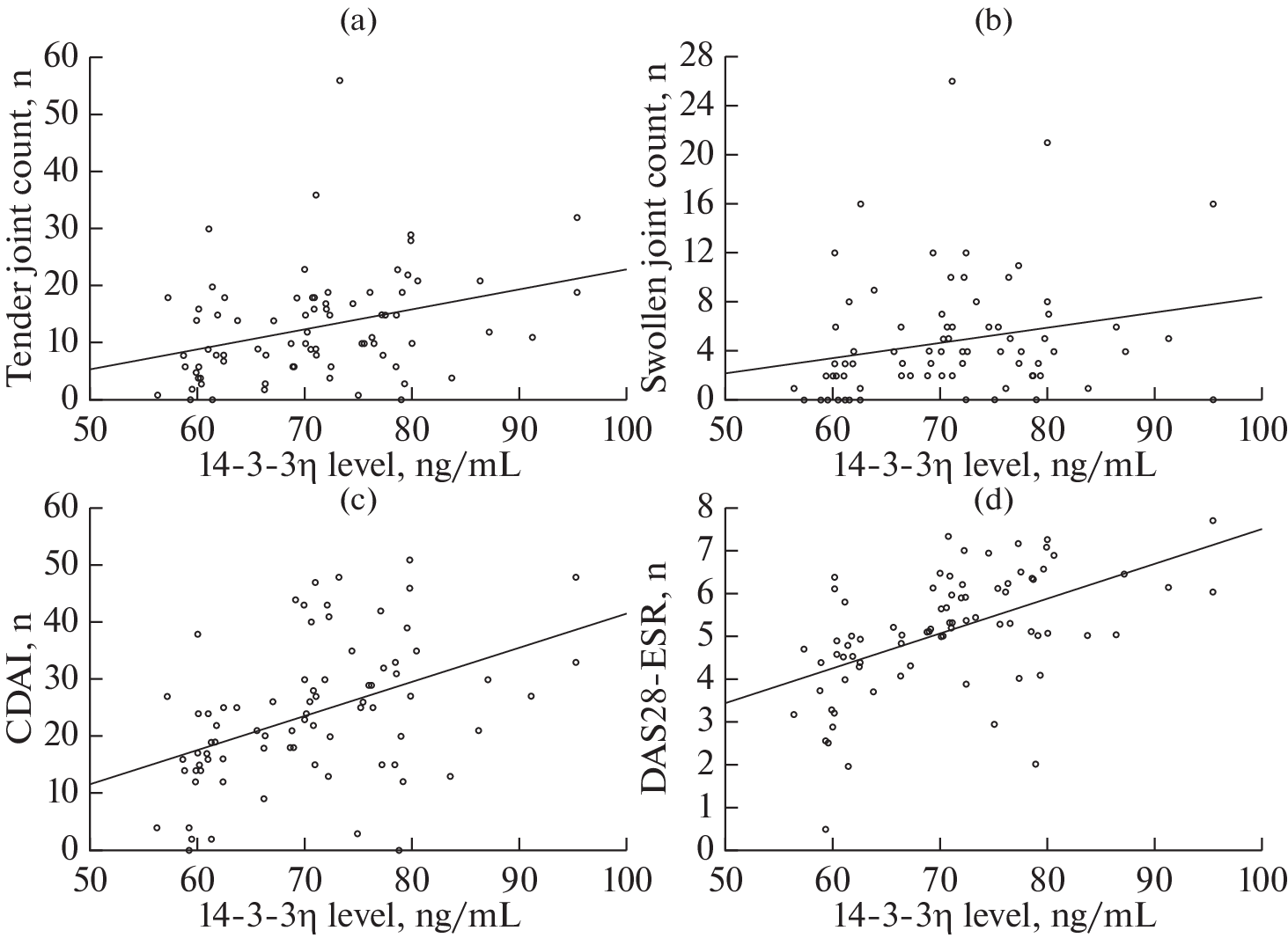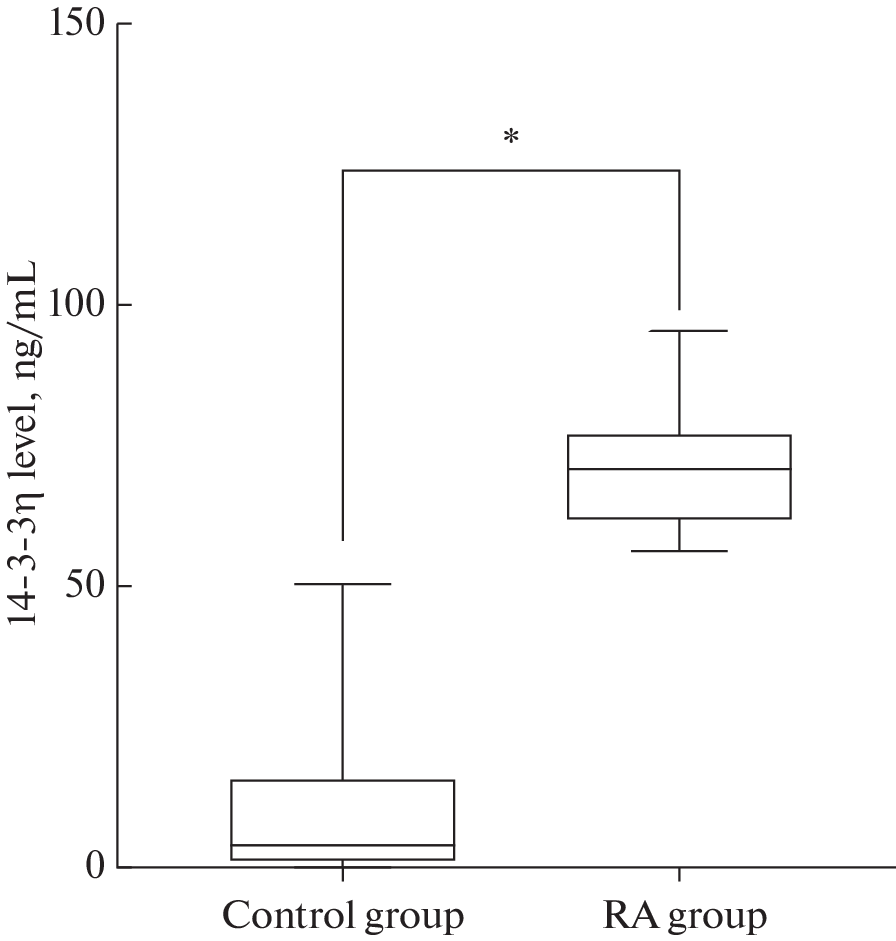 Currently, rheumatoid arthritis routine diagnosis includes joint syndrome indicator determination such as tender and swollen joints count, as well as a number of laboratory indicators. The most interesting are the second ones, which include rheumatoid factor, antibodies to cyclic citrullinated peptide and a some acute-phase indicators, but they have low sensitivity and specificity, especially in the disease early stages, when it is still possible to normalize bring the age-norm indicators and get stable disease remission. Additionally, some of these medical tests are expensive enough and compulsory health insurance not-included. But, most importantly, there are no reliable rheumatologist modern practice disease activity assessing tools depending on the current-used treatment strategy. The article evaluates 14-3-3η protein usage possibility as a promising biomarker for rheumatoid arthritis immuno-inflammatory process activity in joints assessment. It was shown a higher studied indicator informative value (in terms of accuracy, sensitivity, specificity) in comparison with traditional acute-phase indicators, such as the erythrocyte sedimentation rate and C-reactive protein.