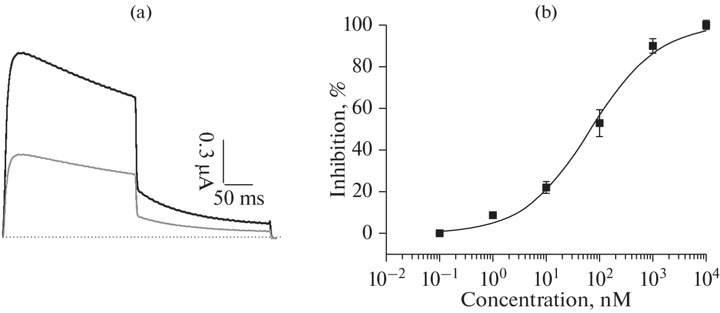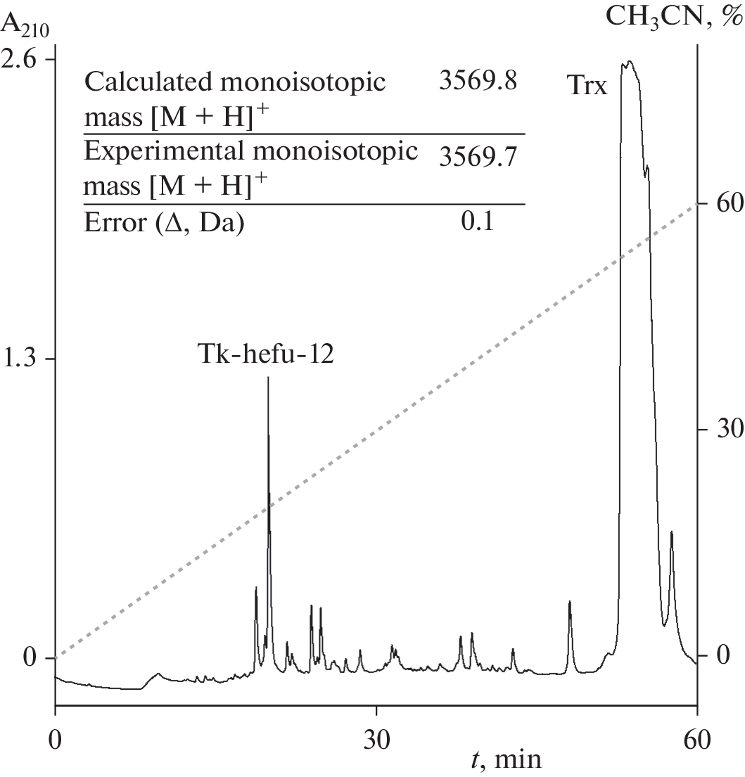 Актуальной задачей современной физиологии и фармакологии является получение соединений, обладающих специфичностью в отношении определенных изоформ ионных каналов. В серии статей мы показали, что α-гарпининовая укладка может служить шаблоном для рационального проектирования пептидных лигандов калиевых каналов. В данной работе было использовано молекулярное моделирование, чтобы оптимизировать структуру ранее полученного пептида Tk-hefu-10, селективного блокатора каналов KV1.3, полумаксимальная концентрация ингибирования (ИК50) для которого составляет ≈150 нМ. Расчеты молекулярной динамики комплекса Tk-hefu-10–KV1.3 предоставили информацию о взаимодействии отдельных аминокислотных остатков пептида и канала, а анализ этих взаимодействий позволил предложить аминокислотные замены в структуре Tk-hefu-10 для увеличения его аффинности. Новый пептид Tk-hefu-12 представляет собой укороченный на один остаток аналог Tk-hefu-10 с пятью заменами; экспериментальная проверка активности показала, что его ИК50 ≈ 70 нМ против KV1.3. Кроме того, в структуре Tk-hefu-12 отсутствуют остатки метионина, что позволяет перейти к получению пептидов линейки Tk-hefu с использованием бромциана.