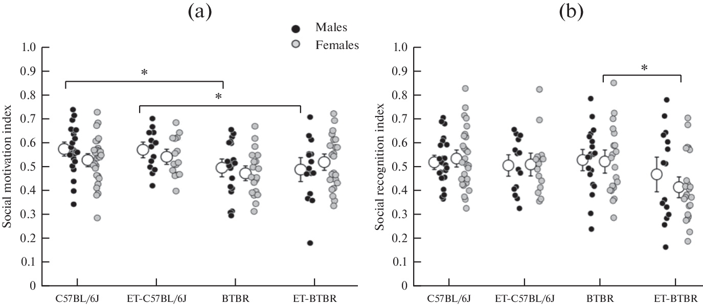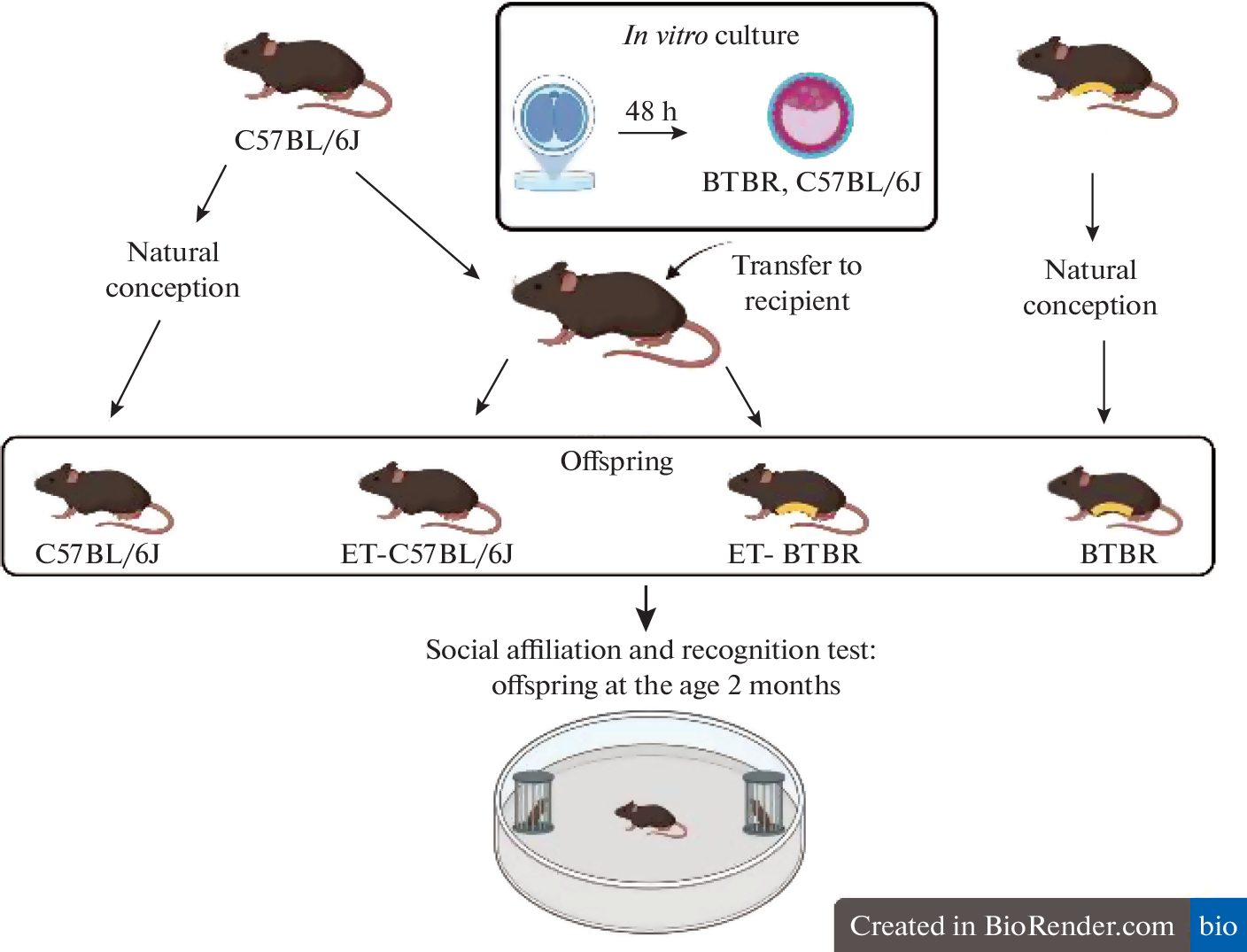 The present work is the first attempt to study the effect of such assisted reproductive technologies (ARTs), as in vitro culture of preimplantation embryos on the social behavior of offspring, using BTBR mice (BTBR T+Itpr3tf/J) as an idiopathic model of a-utism. The C57BL/6J mice were used as controls. Social behavior was studied in adult offspring mice obtained after in vitro culture and embryo transfer (ET) (groups ET-C57BL/6J and ET-BTBR). The BTBR mice demonstrated the reduced levels of social recognition and affiliation compared to C57BL/6J mice. The social affiliation and recognition test revealed that ET-C57BL/6J males had a high level of social interaction, which was of similar magnitude as in naturally conceived C57BL/6J males. However, ET-C57BL/6J and ET-BTBR females demonstrated a decrease in interest to a new stranger compared to naturally conceived controls of the same sex, which was revealed in a social recognition session of this test. Thus, the in vitro culture affected the social recognition in the offspring of C57BL/6J and BTBR mice, but only in females.