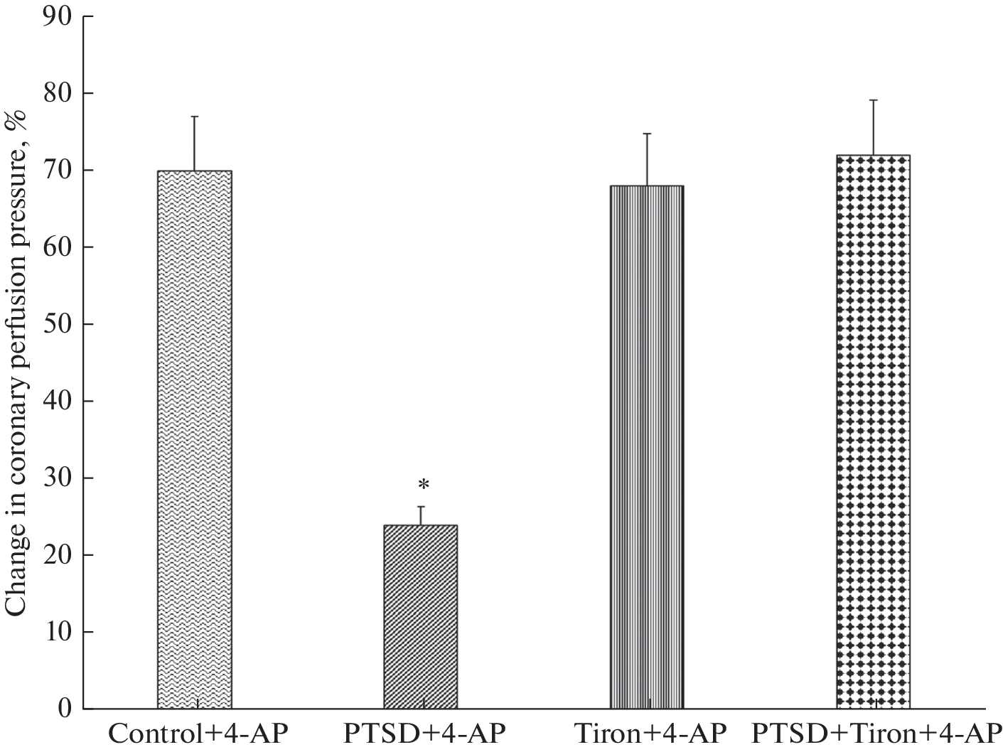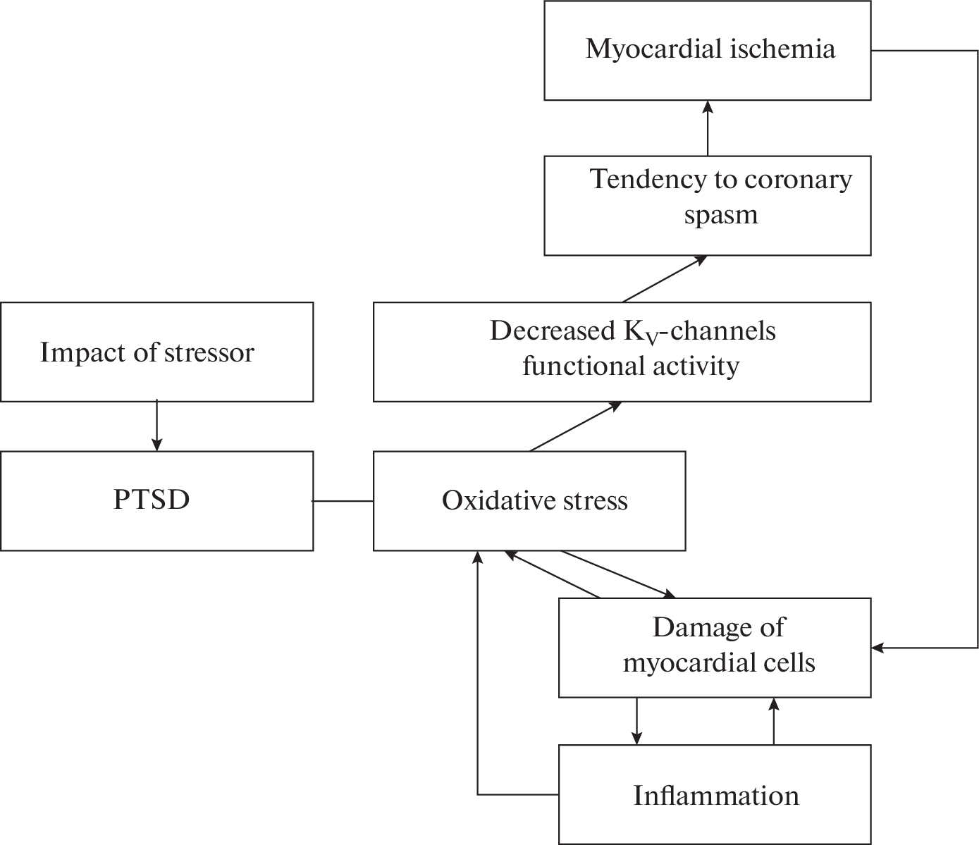 The purpose of the research was to study the contribution of the superoxide radical (\({\text{O}}_{2}^{{\centerdot - }}\)) to the mechanisms of the coronary KV-channels functional activity impairment in rats with posttraumatic stress disorder (PTSD). The study was performed on 117 outbred white male rats (Rattus, Muridae weighing 210–240 g). To reproduce the experimental analogue of PTSD, the modified model of “a predator presence imitation” was applied (contact with cats’ excrements for 10 days, 15 minutes daily). The PTSD development was confirmed by behavioral changes of affected animals in the “Open Field” test. The coronary vessels’ tone was studied on the isolated by the Langendorf’s method isotonically contracted hearts, which were perfused under constant flow with Krebs–Henseleit solution. The contribution of \({\text{O}}_{2}^{{\centerdot - }}\) to the coronary vascular tone regulation was studied by infusion of the superoxide radical “scavenger” Tiron (4,5-dihydroxy-1,3-benzenedisulfonic acid) in the perfusion solution. The functional activity of KV-channels was assessed by the degree of increase in the coronary perfusion pressure (CPP) in response to 4-aminopyridine (4-AP), a blocker of KV-channels. To elucidate the role of \({\text{O}}_{2}^{{\centerdot - }}\) in the KV‑channels functional activity of coronary vessels, Tiron and 4-AP were infused in the perfusion solution. The concentration of diene conjugates (DCs), malondialdehyde (MDA), C‑reactive protein (C-RP) and interleukin 1β (IL-1β) as well as catalase (CAT) and superoxide dismutase (SOD) activity were detected in the blood serum of experimental animals. The CPP in the isolated rats’ hearts after PTSD was 30% lower at coronary flow rate 10 mL/min compared to the control group. Under the influence of 4-AP, CPP increased by 70% and by 24% in the “Control” and “PTSD” groups, respectively. Under influence of Tiron, the CPP in the “PTSD” group at coronary flow rate 10 mL/min was 52% lower than in the control. In the “PTSD + Tiron + 4-AP” group the CPP augmentation (71.5%) was comparable to that in the hearts of the “Control” group after 4-AP exposure. The IL-1β, C-RP, DCs and MDA concentration in the blood serum of rats with PTSD was 3, 1.6, 3.3 and 3.6 times higher than in the control rats’ blood serum, while SOD and CAT activity was by 27 and 59% lower, compared to control, respectively. In the course of the investigation, it was found that \({\text{O}}_{2}^{{\centerdot - }}\) overproduction due to oxidative stress might be an important mechanism of a poststressor “channelopathy”, which is characterized by the decreased functional activity of the KV-channels of coronary vessels following PTSD.