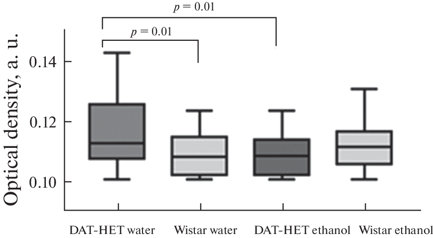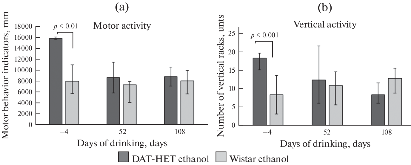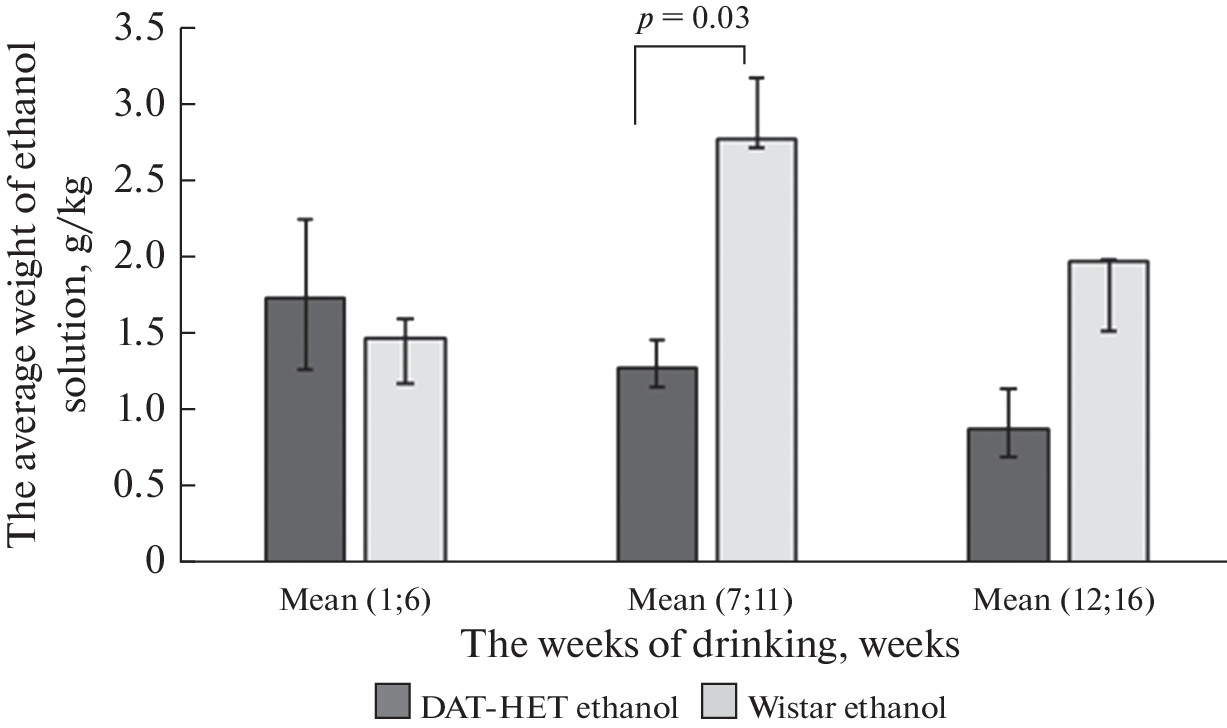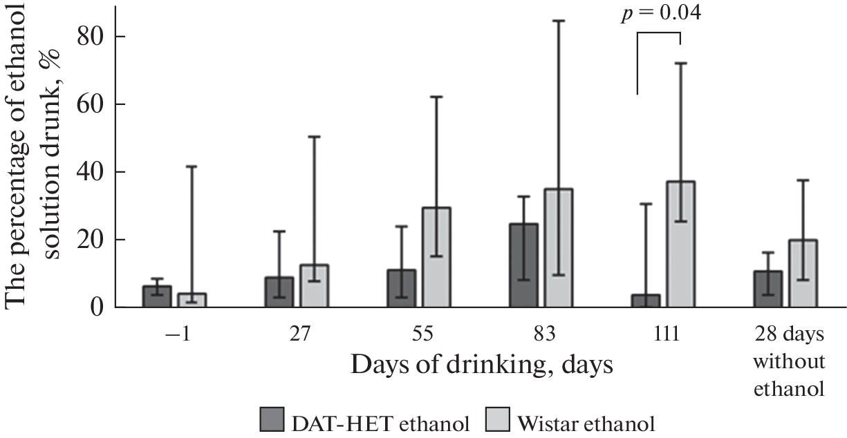 DAT-HET rats with their underlying hyperdopaminergia are a promising model for the investigation of neuropsychiatric diseases, which are based on impaired dopamine neurotransmission, including alcoholism. The aim of the work was to evaluate the effect of free alcoholization on drinking, locomotor, exploratory behavior, anxiety, and Tyrosine hydroxylase (TH) levels in rats with impaired functioning of the DA system (DAT-HET). The study was carried out on adult male rats of the DAT-HET (n = 15) and Wistar (n = 13), which were divided into 4 groups: “DAT-HET ethanol” (n = 10) and “Wistar ethanol” (n = 9), who were in the mode of free alcoholization for 112 days of the experiment. The DAT-HET water (n = 5) and Wistar water (n = 4) groups did not have access to an ethanol solution and did not participate in behavioral tests. Ethanol preference and consumption was assessed in the “Two-bottle test”. The amount of ethanol consumed in the cells was recorded weekly. Behavior was assessed using the Open Field and Elevated Plus Maze tests. After alcoholization, to assess the level of TH, an immunohistochemical (IHC). It was found that during free alcoholization, DAT-HET rats do not form preferences for ethanol. Under the low ethanol consumption, the initial hyperactivity in DAT-HET rats is leveled. The DAT-HET model leads to an increase in TH levels in NAcc. In addition, the free alcoholization reduces the level of TG in NAcc with the development of a pathological increase in TH, observed in the DAT-HET model, but has no effect on healthy animals.
