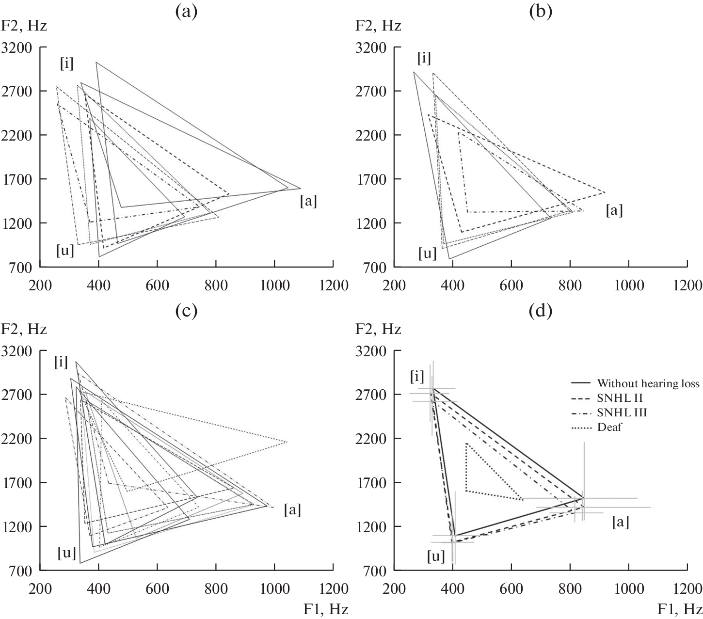 Chronic sensorineural hearing loss (SNHL) is characterized by an increase in hearing thresholds at basic speech frequencies, which implies the auditory speech feedback control worsening and, as a result, changes of speech characteristics. A hypothesis was tested that such worsening can manifest itself in an increase of F0, F1, F2 formants of speech vowel sounds in patients with moderate and moderately severe postlingual SNHL. Recordings of elicited speech were performed for young and middle age women (36–59 years): 7 women speakers with moderate SNHL who did not use hearing aids; 5 women speakers with moderately severe SNHL who were hearing aid users but were not using them during the recordings; a control group of 12 normally hearing women speakers. An assessment of F0, F1 and F2 of stressed vowels [a], [i], [u] and calculations of vowels’ centralization indices – vowel space area, vowel formant centralization ratio and the second formant ratio (F2i/F2u), were performed. All the studied spectral indices in groups of patients with postlingual SNHL were similar to those in the control group, no statistically reliable differences were revealed.