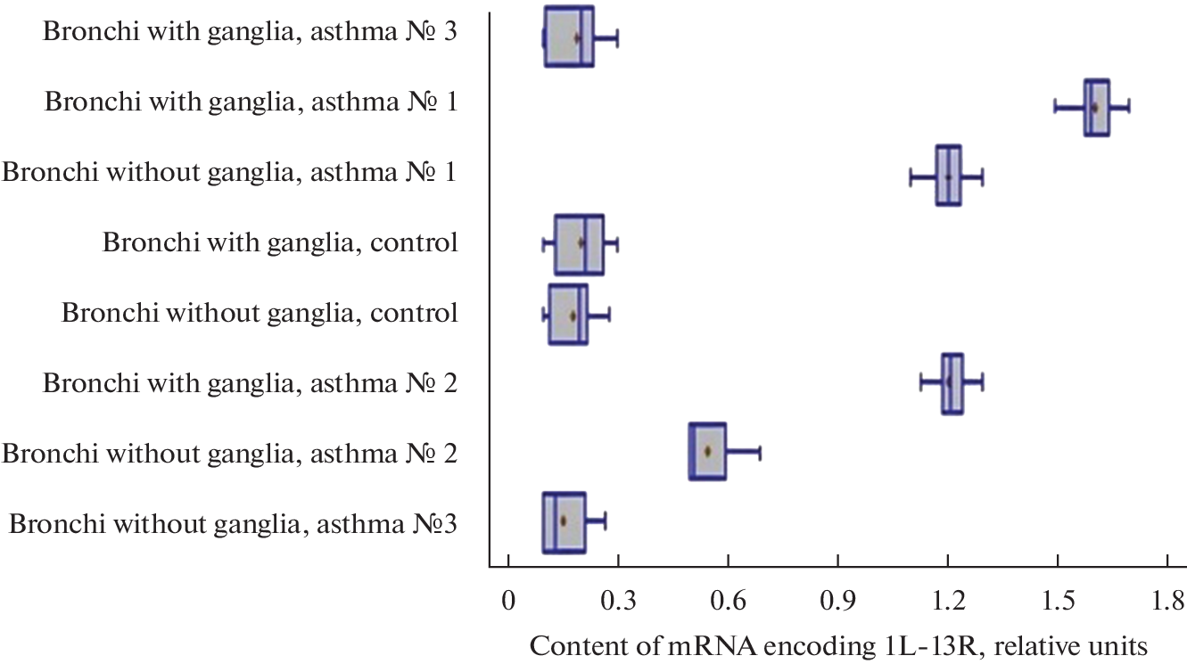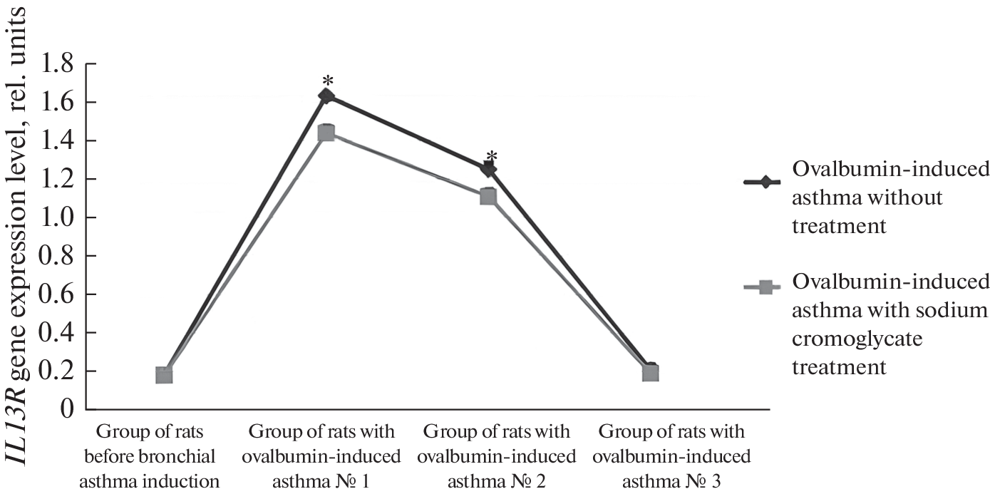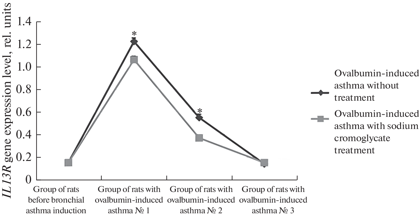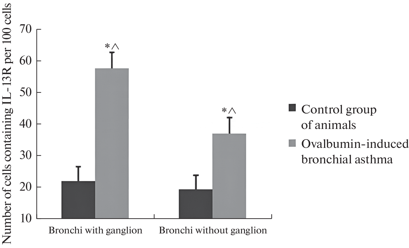 This article presents the results of studies of the levels of expression of the IL13R gene and the levels of expression of the molecular IL13R in the bronchi of control rats and rats with ovalbumin-induced asthma. The choice of these receptors is due to the great importance of these structures in the pathogenesis of allergic bronchial asthma. Biological materials of 64 Wistar rats were studied using real-time PCR and immunohistochemical methods. As a result of the studies, it was found that under conditions of asthma development in the tissues of the bronchi of rats, a pronounced expression of the IL13R genes, a significant expression of the molecular receptor for interleukin-13, occurs. In bronchi with an intramural ganglion (bifurcation zone), the level of IL13R gene expression and the level of expression of the IL13R molecular receptor were significantly higher than in tracheal samples without ganglia. Sodium cromoglycate, administered to rats 5 hours after the last inhalation of ovalbumin, led to a decrease in the mRNA content in the bronchi of animals compared to animals that did not receive mast cell stabilizer treatment.