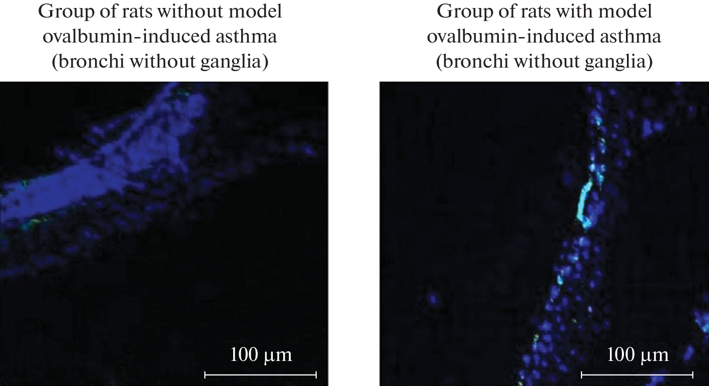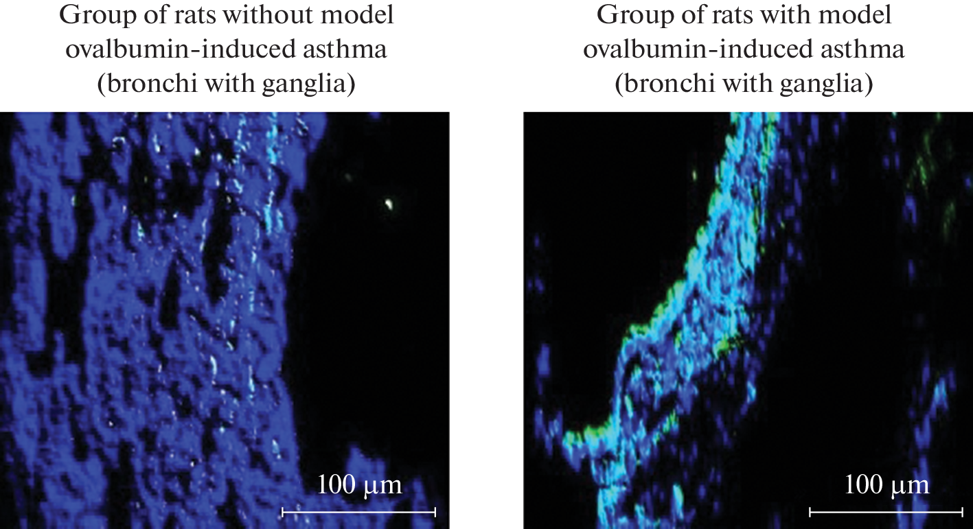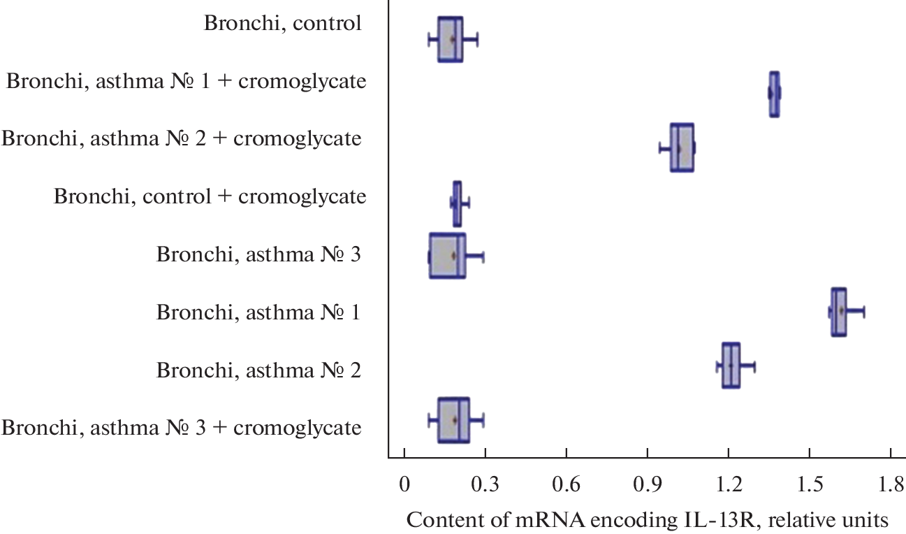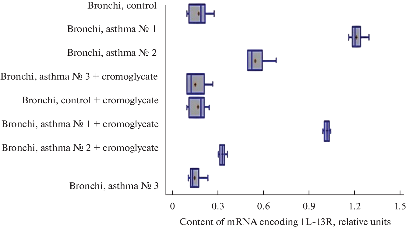 This article presents the results of studies of the levels of expression of the IL13R gene and the levels of expression of the molecular IL13R in the bronchi of control rats and rats with ovalbumin-induced asthma. The choice of these receptors is due to the great importance of these structures in the pathogenesis of allergic bronchial asthma. Biological materials of 64 Wistar rats were studied using real-time PCR and immunohistochemical methods. As a result of the studies, it was found that under conditions of asthma development in the tissues of the bronchi of rats, a pronounced expression of the IL13R genes, a significant expression of the molecular receptor for interleukin-13, occurs. In bronchi with an intramural ganglion (bifurcation zone), the level of IL13R gene expression and the level of expression of the IL13R molecular receptor were significantly higher than in tracheal samples without ganglia. Sodium cromoglycate, administered to rats 5 hours after the last inhalation of ovalbumin, led to a decrease in the mRNA content in the bronchi of animals compared to animals that did not receive mast cell stabilizer treatment.