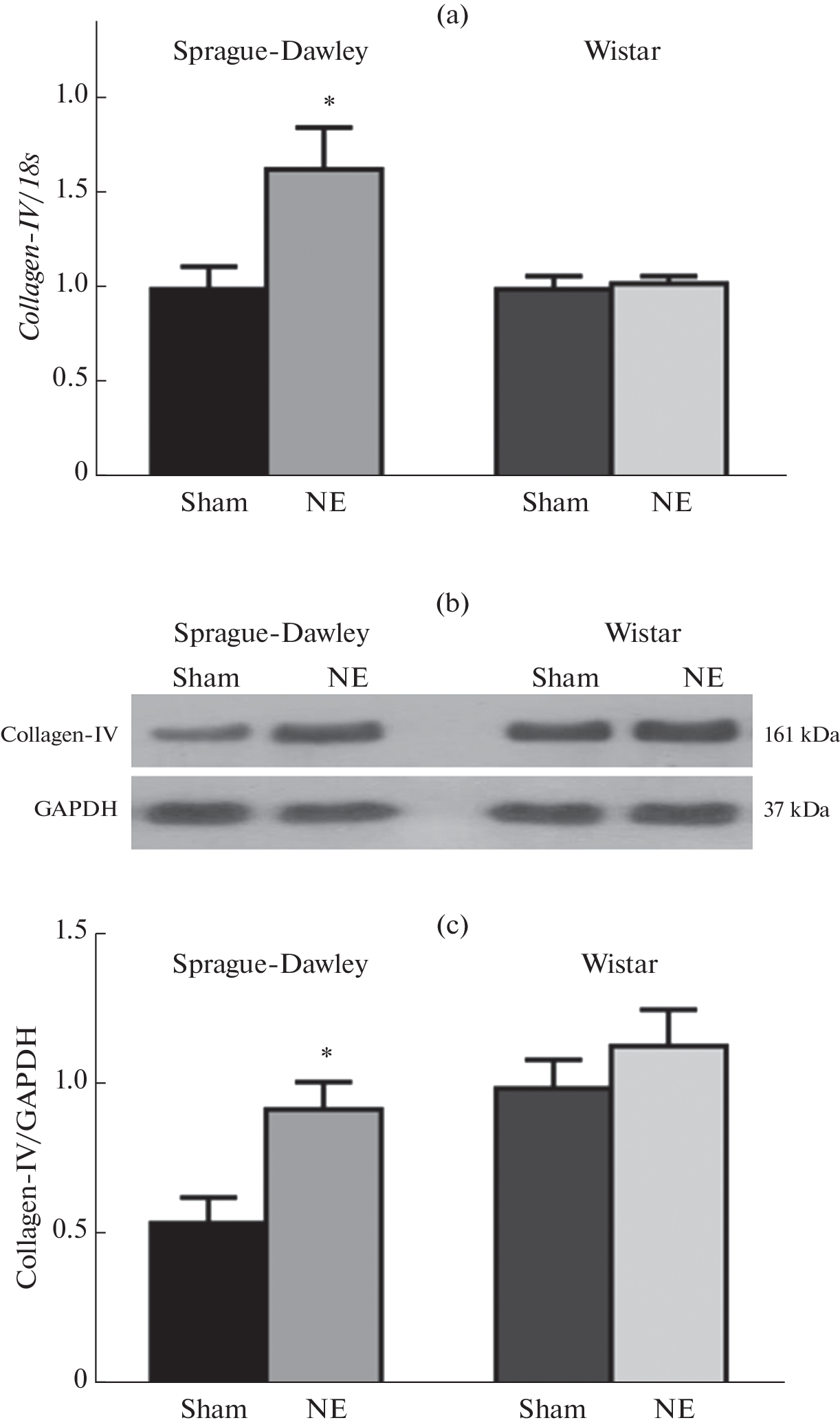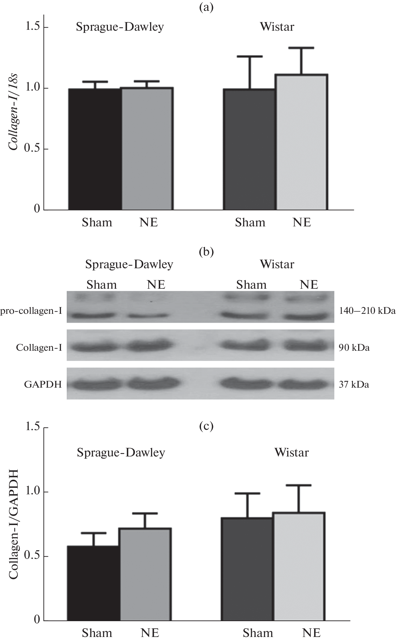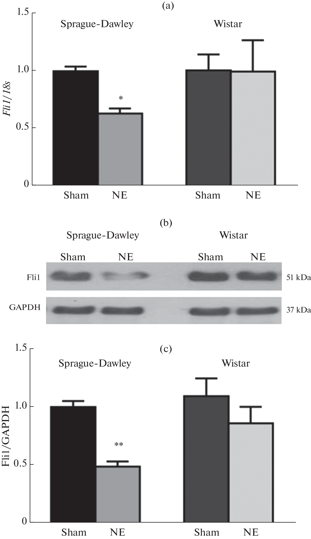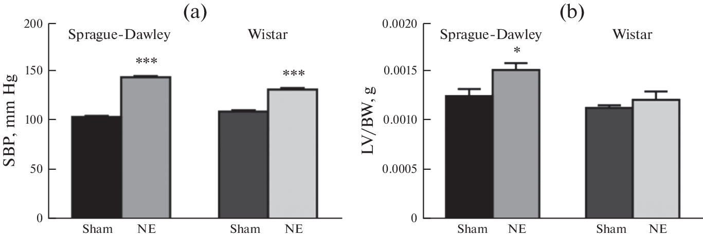 The severity of the development of uremic cardiomyopathy (UC) and fibrosis of cardiac tissue at chronic renal failure (CRF) was compared in the model experiments on male Sprague-Dawley and Wistar rats of the SPF category. To induce CRF in rats, subtotal nephrectomy (NE) was performed on the left, and after 2 weeks, total nephrectomy on the right. Sham-operated (Sham) animals served as controls. 4 weeks after the second surgery, blood pressure (BP) was measured in animals, and the expression of fibrotic factors (transcription factor Fli1, pro-collagen-I, collagen-I and collagen-IV) in the tissues of heart left ventricle was evaluated by real-time PCR and immunoblotting. After NE, Sprague-Dawley rats exhibited a significant increase in systolic blood pressure and left ventricular hypertrophy. In Wistar rats, the difference in BP between NE and Sham animals was smaller, and the ratio of left ventricular mass to body weight did not change. Experimental CRF in Sprague-Dawley rats was accompanied by a 1.5–2.5-fold suppression of the Fli1 gene expression and a decrease in the content of Fli1 protein in the cardiac tissue, while no significant differences were observed in Wistar rats. The levels of pro-collagen-I and collagen-I in the heart of rats of both lines did not change either at the levels of transcription or translation. Such difference in development of pathological processes indicates ineffectiveness of applied NE scheme for induction of UC and investigation of pro-fibrotic processes in Wistar rats.