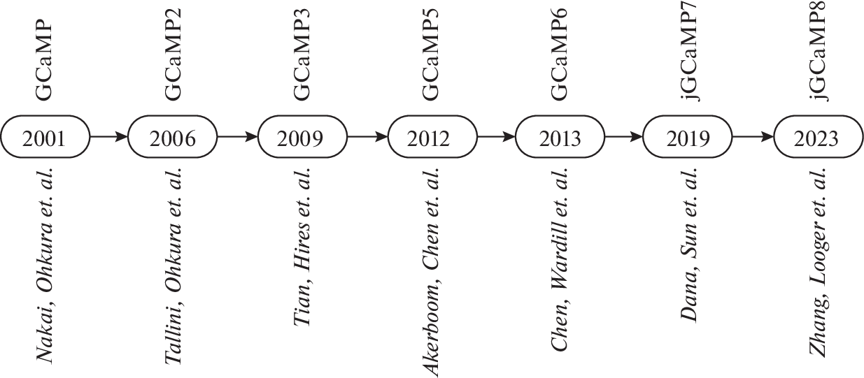 Однофлуорофорные генетически кодируемые кальциевые индикаторы, такие как GCaMP, являются широко используемыми инструментами для изучения нейрональной активности. Их главным преимуществом является способность в режиме реального времени и с высокой чувствительностью реагировать на изменения концентрации ионов кальция в клетке. Это особенно важно для исследования нейрональных процессов и нейронных ансамблей, где кальциевые сигналы играют ключевую роль в передаче информации. Данный обзор рассматривает семейство кальциевых индикаторов GCaMP, описывает их разновидности, особенности и перспективы использования для визуализации нейронной активности. Особое внимание уделяется тенденции совершенствования GCaMP, в частности направленной на расширение их спектральных свойств и способности регистрировать высокочастотную спайковую активность.