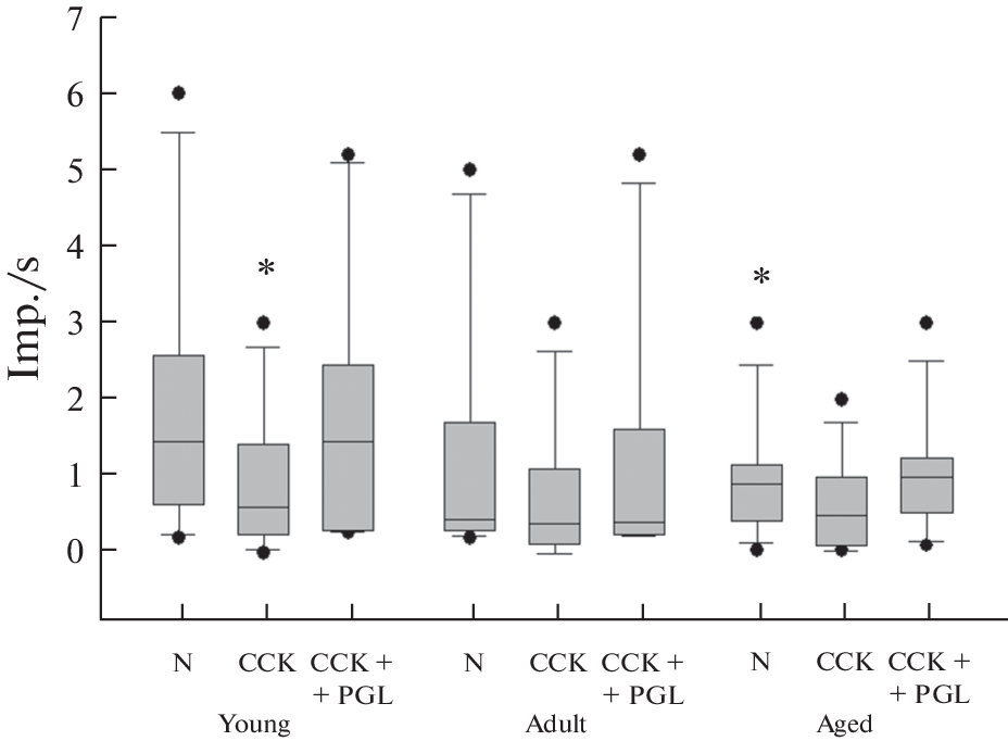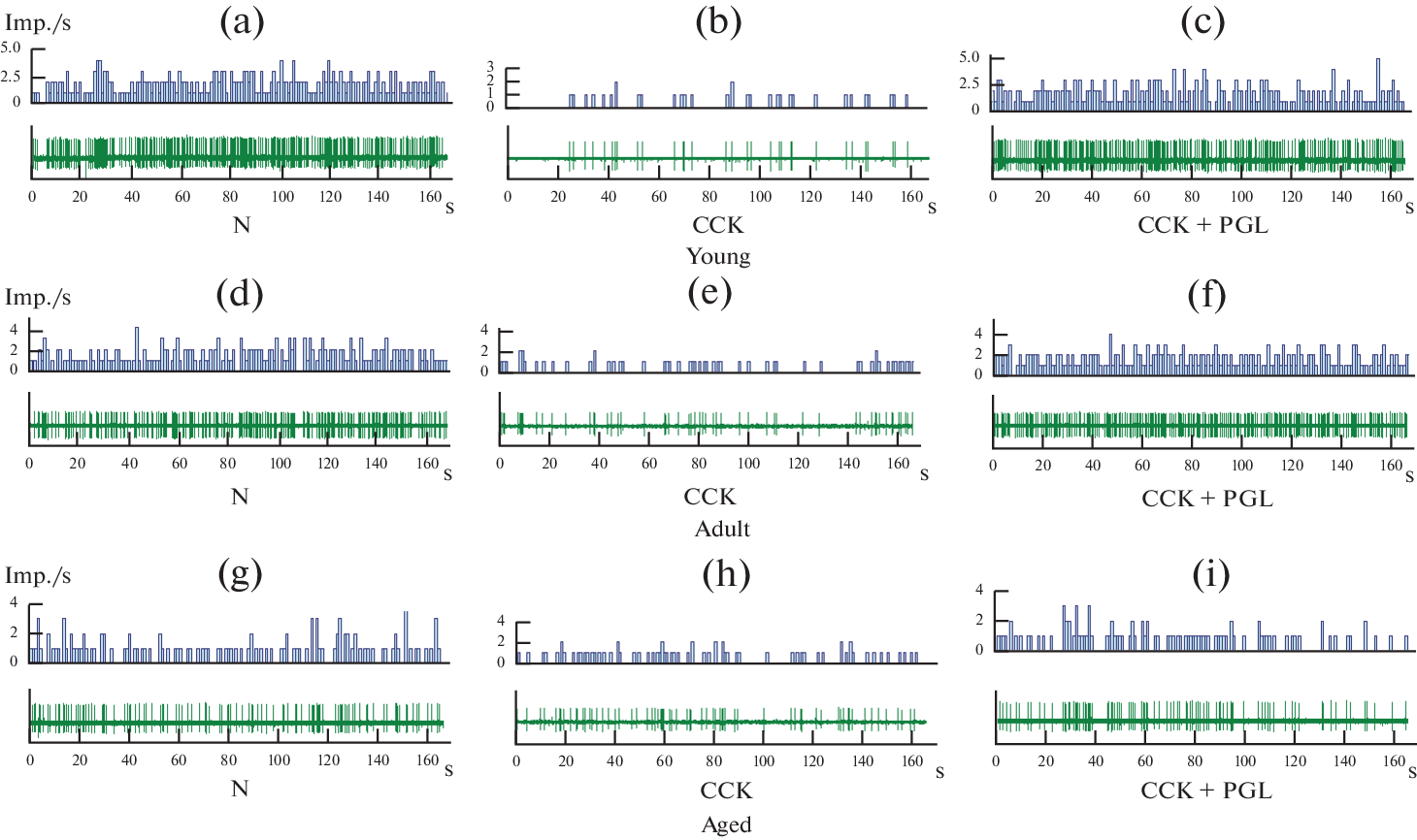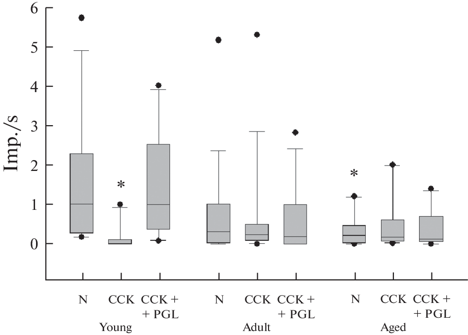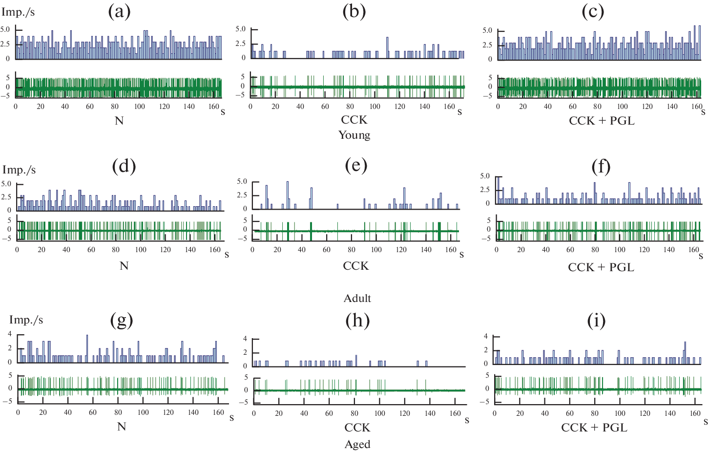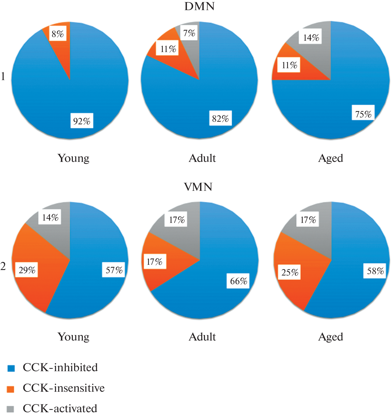 The aim of the work was to analyze the background and induced by the intravenous administration of the cholecystokinin sulfated octapeptide (CCK), as well as the cholecystokinin antagonist proglumide impulse neuronal electrical activity in the dorsomedial (DMN) and ventromedial (VMN) nuclei of the hypothalamus in young (2–3 months), adults (12 months) and aged (24 months) male rats under urethane anesthesia. The mean frequency of background discharges after the injection of CCK in young rats in the DMN significantly decreased from 1.5 ± 0.4 to 0.2 ± 0.1 impulse/s, in the VMN from 2.0 ± 0.4 to 0.9 ± 0.2 impulse/s. Simultaneous administration of CCK and proglumide did not lead to change of frequencies of neuronal activity in this age group. In adult and aged rats, the mean of the background frequency of discharges of neurons in the DMN and VMN was lower than in young rats and did not change significantly under the influence of CCK and proglumide. In DMN and VMN, the most of the neurons were inhibited by CCK, while in DMN the percentage of neurons inhibited by CCK was higher compared to VMN. The DMN of young animals lacked the CCK-activated neurons that appeared in adult and old animals. Thus, this study confirms the elevation theory of aging, which consists in a decrease in the sensitivity of the hypothalamus to homeostatic signals, in particular, hormones that regulate eating behavior.