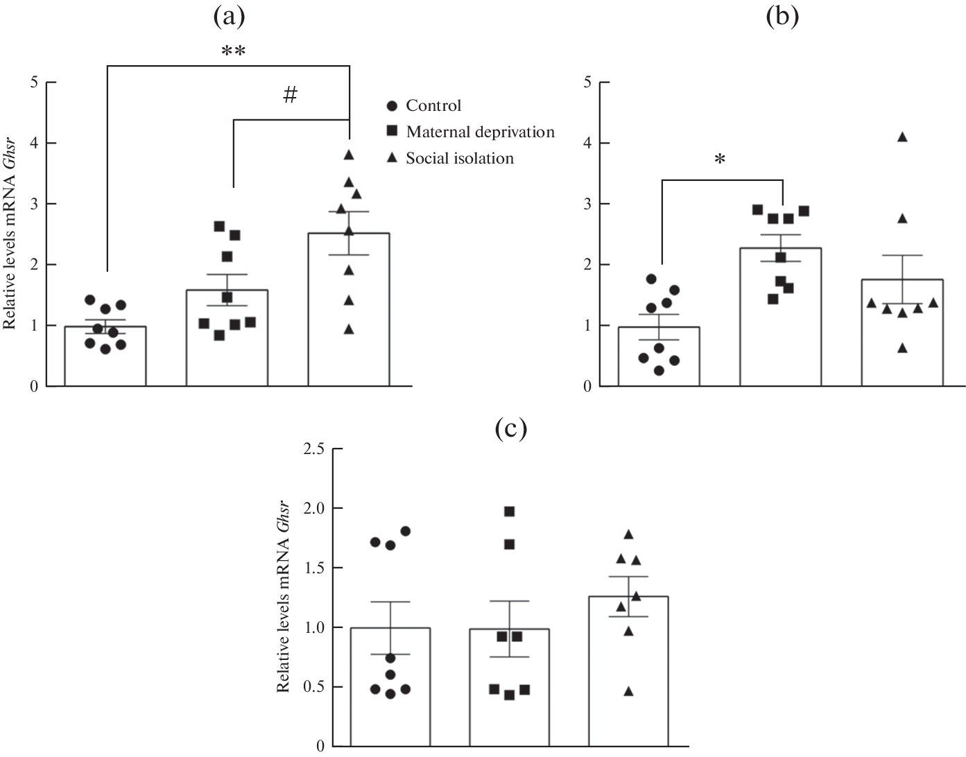 We investigated the role of ghrelin and its receptors in the manifestation of gambling a-ddiction elements in rats exposed to early psychogenic stress. Rearing in conditions of social isolation or maternal deprivation in early ontogeny increased risk behavior and impulsivity in the Iowa Gambling Task test: animals sought more food reinforcement, but with a low probability. Maternal deprivation or rearing in social isolation increased expression of Ghsr in the amygdala and hypothalamus respectively. The level of expression of the gene under study in the prefrontal cortex did not change. It is concluded that early psychogenic stress causes an imbalance in the brain ghrelin regulatory system, which manifests itself in increased of Ghsr level as well as elements of gambling addiction. The scheme of the effect of chronic stress on the hypothalamic ghrelin system and on the extrahypothalamic regulation of ghrelin is presented.