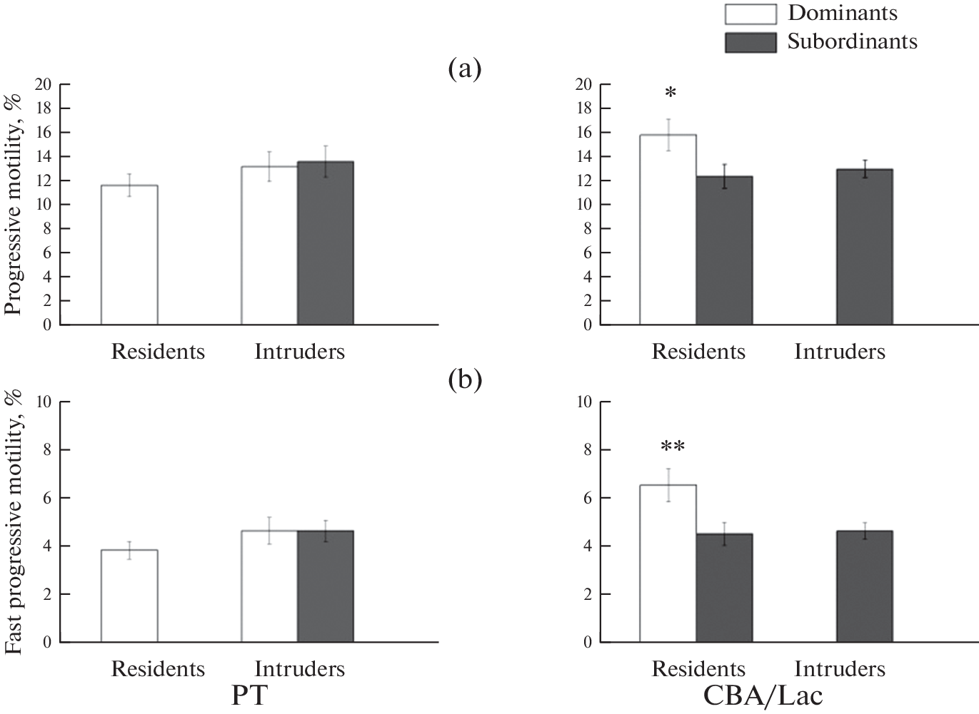 Известно, что репродуктивный успех самца зависит от способности к социальному доминированию, а также качества, количества сперматозоидов и адекватной продукции репродуктивных гормонов. Взаимосвязь между социальным доминированием и тестикулярной функцией может модулироваться генотипом и средовыми условиями формирования иерархии, в частности территориальным статусом самца (резидент или интрудер), однако характер и механизмы этой взаимосвязи недостаточно исследованы. Целью настоящей работы стало исследование влияния предварительного освоения территории и генотипа на тестикулярную функцию при установлении доминантно-субординантных отношений в экспериментальной модели социального доминирования у лабораторных мышей, используя парадигму “резидент–интрудер”. Для этого взрослому самцу-резиденту определенного генотипа (PT или CBA/Lac), который проживал с самкой линии DD/He двое суток в экспериментальной клетке, подсаживали самца-интрудера другой линии (PT или CBA/Lac) и оценивали социальный статус самцов после установления иерархических отношений. Через 5 дней после формирования группы у самцов оценивали уровень тестостерона в сыворотке и содержание его в семенниках, а также сперматогенные параметры. Установлено, что формирование иерархических отношений не оказывает влияния на уровень тестостерона в крови и семенниках и долю морфологически аномальных головок сперматозоидов у самцов мышей обеих линий, но приводит к уменьшению количества эпидидимальных сперматозоидов у доминантов-интрудеров линии РТ по сравнению с субординантами-интрудерами этой линии, а также снижению подвижности сперматозоидов у подчиненных самцов линии CBA/Lac независимо от территориального статуса. Таким образом, установление доминантно-субординантных отношений в этологической модели социальной иерархии у лабораторных мышей оказывает влияние на сперматогенную функцию самцов уже через 5 дней после формирования группы, при этом характер этого влияния зависит от генотипа животного, его социального и территориального статуса (резидент или интрудер).