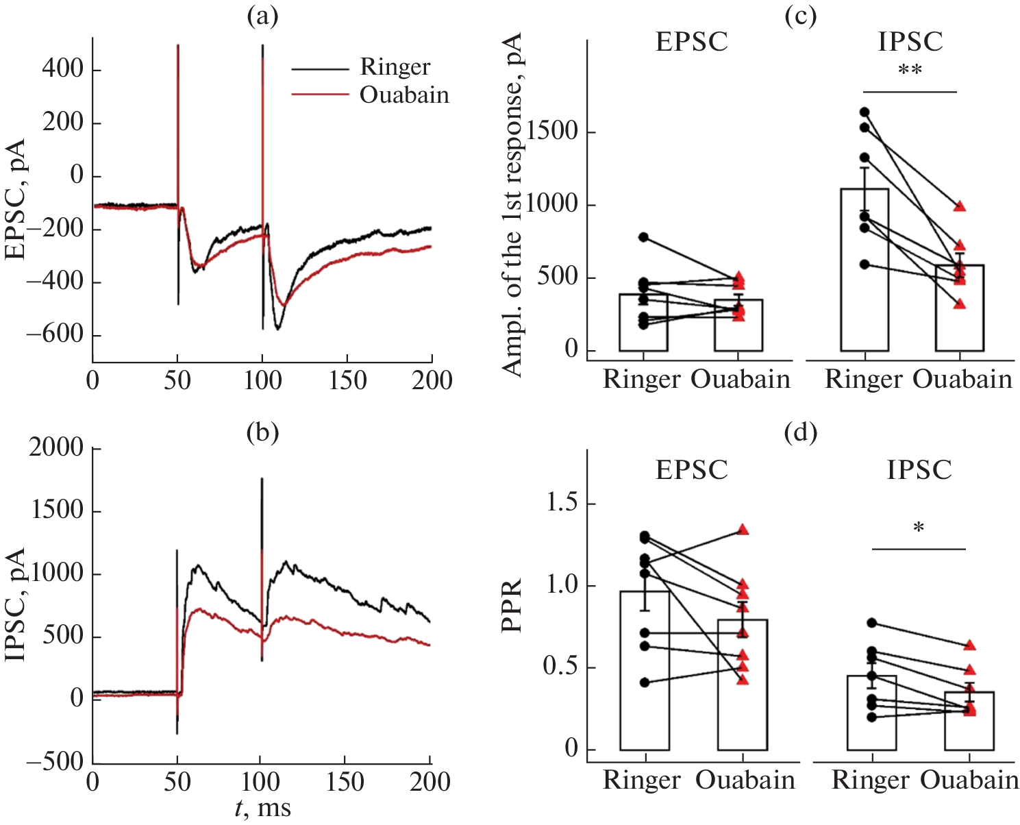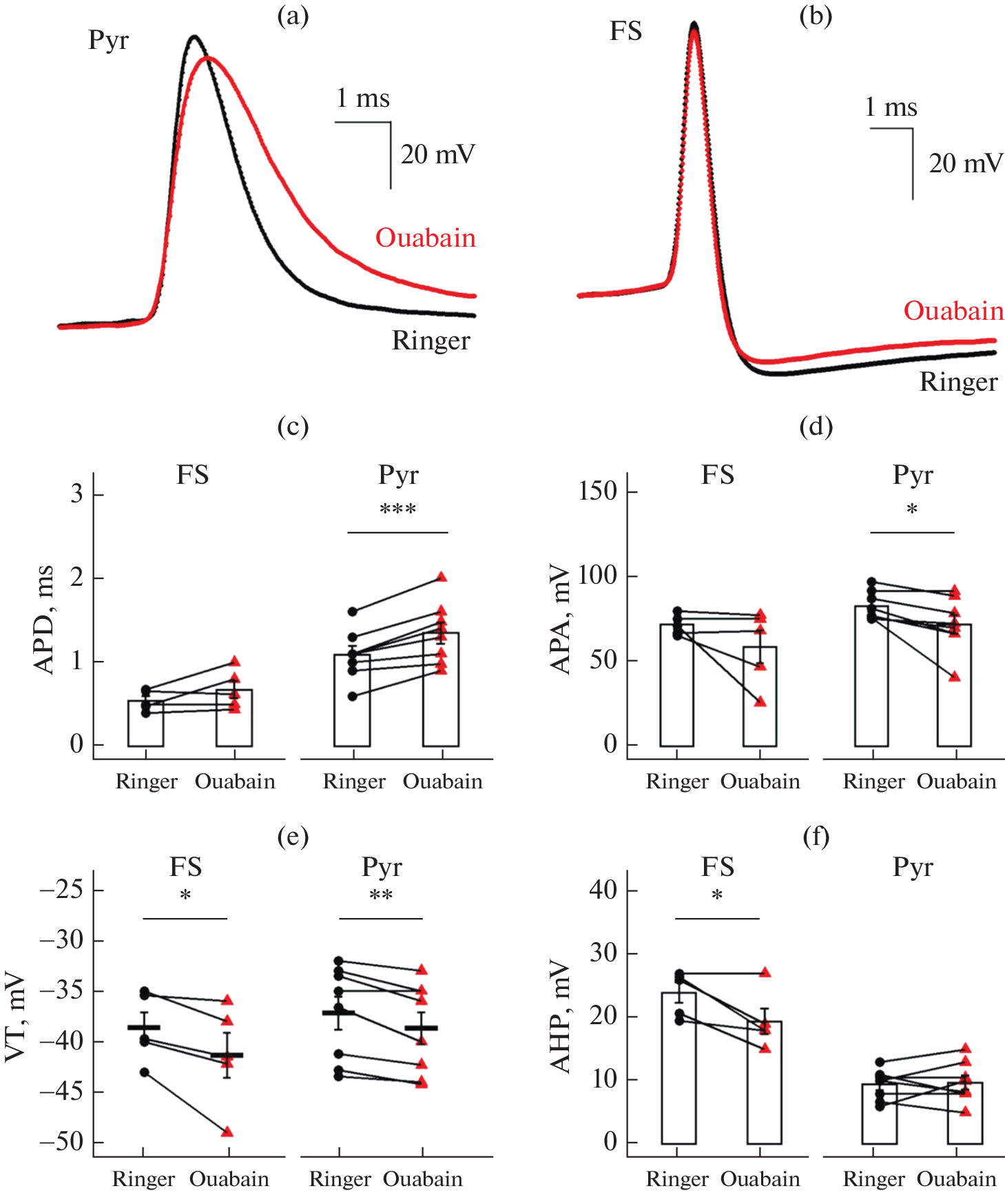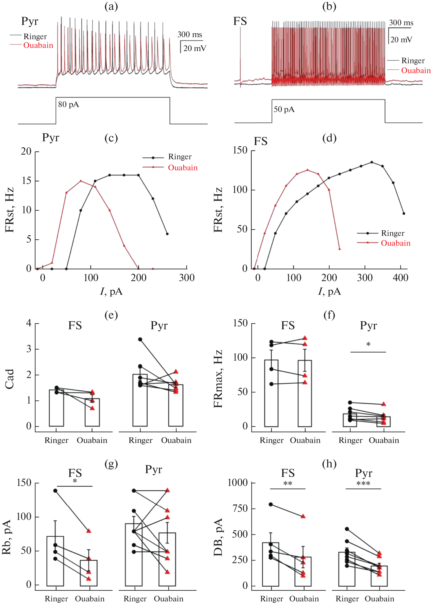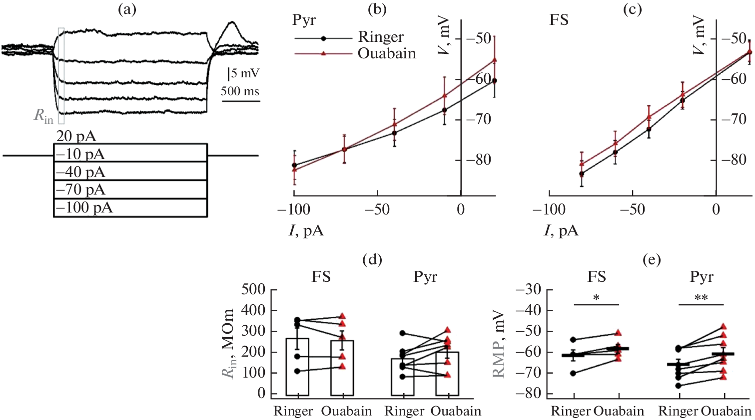Na+/K+-ATPase maintains the neuron’s resting potential and the transmembrane gradient of K+ and Na+ cations, thus regulating ion transport and cellular volume. Mutations in Na+/K+-ATPase genes that impair its function can cause significant impairments in the nervous system function, including the development of epilepsy, if not lethal. Different forms of Na+/K+-ATPase are expressed in various classes of neurons and exhibit different characteristics. Thus, the impaired function of Na+/K+-ATPase may differentially affect the functioning of inhibitory and excitatory neurons. This study aims to determine the effects of the Na+/K+-ATPase antagonist ouabain on the electrophysiological characteristics of pyramidal cells and fast-spiking interneurons, as well as its impact on synaptic transmission. The results indicate that exposure to 5 µM ouabain results in depolarization of the resting membrane potential by 5 mV, as well as decreased amplitude and increased duration of the action potential of pyramidal neurons. Furthermore, ouabain caused a decrease in the amplitude of afterhyperpolarization in fast-spiking i-nterneurons. Moreover, both types of neurons exhibited a decrease in the threshold of action potential generation and the current at which depolarization block occurs. The addition of ouabain did not alter other electrophysiological characteristics of neurons. Furthermore, ouabain rapidly attenuates GABAergic transmission without affecting e-xcitatory synaptic transmission. These new findings on the effects of ouabain on excitatory pyramidal neurons and inhibitory interneurons contribute to the understanding of the mechanism underlying changes in the balance of excitation and inhibition in neural networks under Na+/K+-ATPase function impairment.