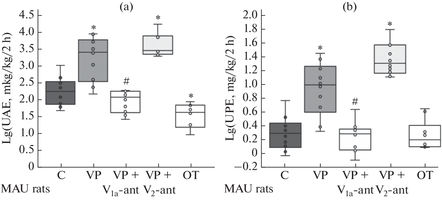 Vasopressin (VP) is one of the main factors affecting intraglomerular hemodynamics, filtration pressure and the state of mesangial cells and contributing to the progression of proteinuria. The aim of this work was to study the effect of neurohypophyseal hormones (VP and oxytocin) on urinary protein excretion. Experiments were performed on Wistar rats, healthy and with microalbuminuria caused by minimal damage to the glomerular filter. Microalbuminuria was modeled by administration of D-nitroarginine methyl ester (D-NAME, 50 mg/kg, intraperitoneally). VP (0.05 and 1.5 nmol/kg) and oxytocin (0.15 nmol/kg) were administered to rats intramuscularly, V2-antagonist (15 nmol/kg) and V1a-antagonist (20 nmol/kg) intraperitoneally. To reduce the level of endogenous VP, animals were given water to drink (10 ml/kg), urine was collected for 2 h, and the levels of total protein, albumin, β2-microglobulin, and immunoglobulin G (IgG) were analyzed. In healthy rats, VP at a dose of 0.05 nmol/kg and oxytocin did not affect albumin excretion, but VP at a dose of 1.5 nmol/kg provoked microalbuminuria. In a model of impaired properties of the glomerular filter caused by the D-NAME administration, VP at a dose of 0.05 nmol/kg and oxytocin led to the normalization of albumin excretion, and VP at a dose of 1.5 nmol/kg caused pronounced proteinuria, albumin excretion increased by 100 times, IgG – by 10 times. Blockade of V2 receptors aggravated protein loss caused by D-NAME and VP (1.5 nmol/kg), while blockade of V1a receptors prevented it. Thus, at high concentrations in the blood, VP enhances protein filtration in the kidney. This effect is mediated by V1a receptors and, depending on the barrier properties of the glomerular filter, leads to the development of microalbuminuria or severe proteinuria. Oxytocin and VP at a dose at which it predominantly activates V2 receptors have an antiproteinuric effect. The revealed effects of neurohypophyseal hormones on albumin excretion open up new promising therapeutic targets for the correction of glomerular dysfunctions.