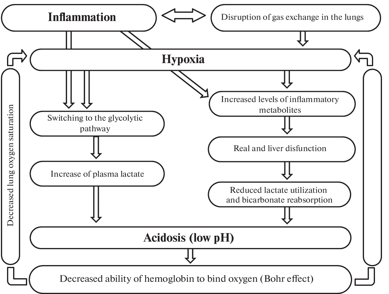 The development of coronavirus infection prevents the transport of oxygen to the tissues through the mechanism of impaired hemoglobin saturation in the damaged lung. The change in the affinity of hemoglobin for oxygen, which is the most important factor in compensating for oxygen deficiency in various pathological conditions, underlies the processes of adaptation to hypoxia. The question of the significance of the shift in the oxyhemoglobin dissociation curve in this pathology is actively discussed, in which its shift to the left in the arterial blood and its shift to the right in the venous blood are noted, which in the conditions of the development of the hypoxic syndrome reflects the a-ctivation of the body’s mechanisms to compensate for oxygen deficiency. The change in its position is not specific for this pathology, but is determined by the severity of oxygen deficiency and the imbalance of the mechanisms of the cardiorespiratory system, as well as the peculiarities of the status of patients and the analyzed blood sample.