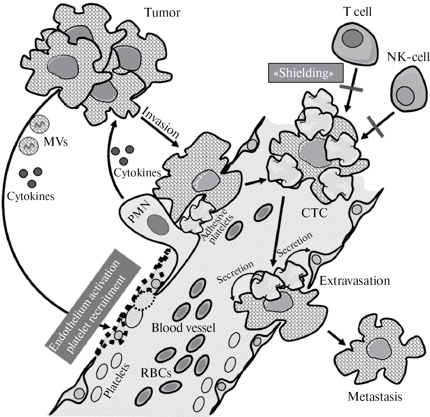 Рис. 1. Схема участия тромбоцитов в метастазировании опухоли. Под действием микроокружения опухоль (Tumor) секретирует цитокины (Cytokines) и микровезикулы (MVs), действующие на эндотелий и приводящие к его активации и рекрутированию тромбоцитов (platelets) в окрестность опухоли. Адгезия и активация тромбоцитов и эндотелия (показана пунктирным контуром) приводит к рекрутированию лейкоцитов (PMN), их экстравазации, секреции цитокинов и факторов роста активированными тромбоцитами и лейкоцитами и стимуляции инвазии опухолевой клетки в сосуд. В сосуде к опухолевой клетке адгезируют тромбоциты, и она становится циркулирующей опухолевой клеткой (CTC), защищенной (“Shielding”) от распознавания иммунной системой (T cell, NK-cell). В месте экстравазации также локализуются тромбоциты, секретирующие содержимое своих гранул (secretion), что способствует экстравазации опухолевой клетки и ее пролиферации на новом месте – образованию метастаза (Metastasis).
