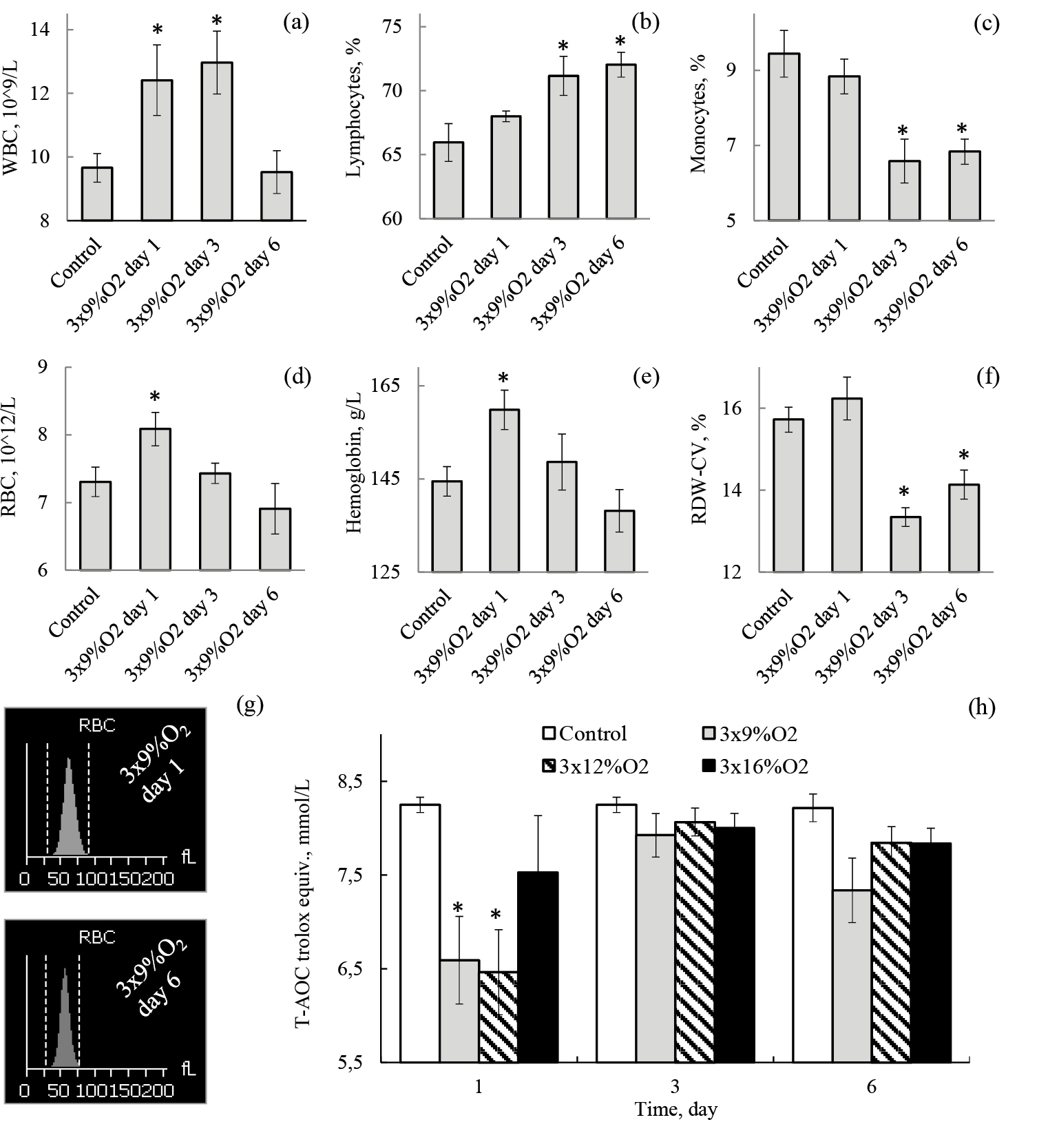 Общий анализ крови проводился после декапитации в первые постгипоксические сутки у животных из контрольной и всех трех экспериментальных групп, а также через 3 и 6 дней после ИГТ у животных из группы 3 × 9% О₂. Клинический анализ крови осуществлен с использованием автоматизированного гематологического анализатора BC-30 Vet (Shenzhen Mindray Bio-medical Electronics Co.Ltd, КНР), который способен выполнять дифференцировку лейкоцитов на 3 субпопуляции и анализ проб, полученных у крыс, по 21 параметру – число лейкоцитов (WBC), лимфоцитов, моноцитов, гранулоцитов и их процентное содержание, количество эритроцитов (RBC), тромбоцитов, крупных тромбоцитов, их относительное количество и средний объем, концентрация гемоглобина, среднее содержание и концентрация гемоглобина в эритроцитах, коэффициент вариации (RDW-CV) и стандартное отклонение (RDW-SD) ширины распределения эритроцитов, гематокрит и ширина распределения тромбоцитов, а также представляет гистограммы лейкоцитов, эритроцитов и тромбоцитов. При анализе использовался режим предварительного разведения, для чего цельную туловищную кровь с ЭДТА добавляли в специальный разбавитель непосредственно перед помещением в геманализатор в двух параллельных пробах.