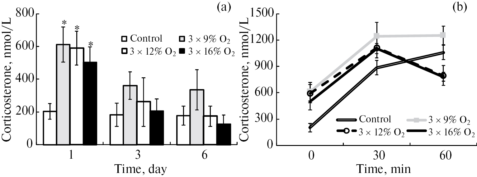 - Для изучения стрессорных уровней кортикостерона использовали сыворотку in vivo, для чего получали периферическую кровь через 1 сутки после последнего сеанса ИГТ из хвоста у живых животных из групп Контроль, 3 × 9% О₂, 3 × 12% О₂ и 3 × 16% О₂, n = 6 в каждой, трехкратно – во время процедурного стресса и через 30 и 60 мин после его начала (см. ниже). Далее выделяли сыворотку, как описано в (b).