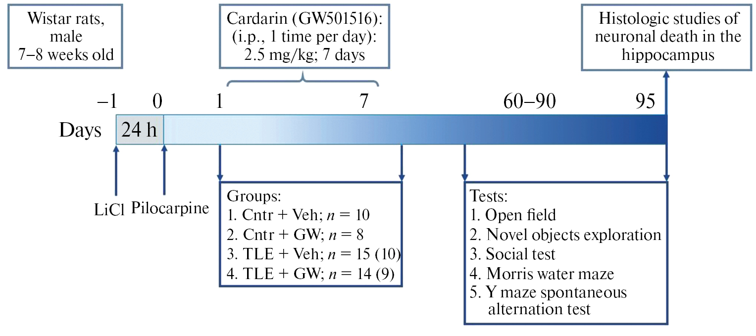 Всего в эксперименте использовано 47 крыс, разделенных на четыре группы случайным образом. 1) Контрольная группа крыс (Cntr+Veh; n = 10) получала LiCl и растворитель (диметилсульфоксид, DMSO) без введения пилокарпина. DMSO использовался в качестве растворителя, т.к. кардарин нерастворим в воде. 2) Вторая группа животных с курсовым введением кардарина (GW 501516; 2.5 мг/кг, в/б), растворенного в DMSO (Cntr+GW; n = 8), эта группа также получала LiCl без введения пилокарпина. 3) Экспериментальная группа без лечения – крысы, которым вводили пилокарпин с растворителем (TLE+Veh; n = 15, выжило 10). 4) Экспериментальная группа с лечением (TLE+GW; n = 14, выжило 9). Препараты вводили курсом в течение недели 1 раз в день в указанной дозе. Первая инъекция проводилась через 24 часа после введения пилокарпина.