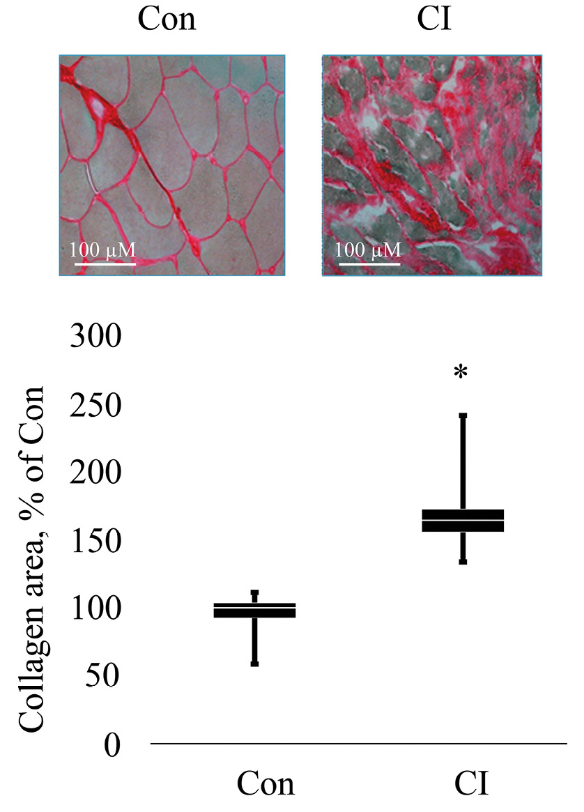 Рис. 1. Окрашивание волокон m.soleus на коллаген. Con – здоровые люди, CI – критические состояния. * – достоверное отличие от Con (p < 0.05). Данные представлены в виде медианы и межквартильного интервала (0.25–0.75) ± минимальное и максимальное значения.