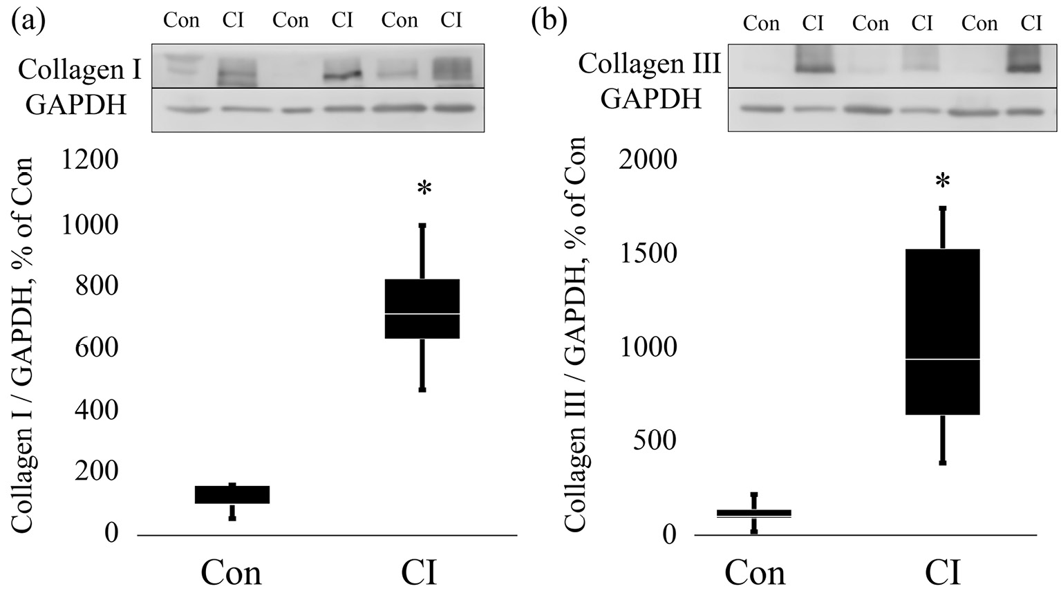 Рис. 2. Содержание коллагена I (a) и коллагена III (b). Con – здоровые люди, CI – критические состояния. * – достоверное отличие от Con (p < 0.05). Данные представлены в виде медианы и межквартильного интервала (0.25–0.75) ± минимальное и максимальное значения.