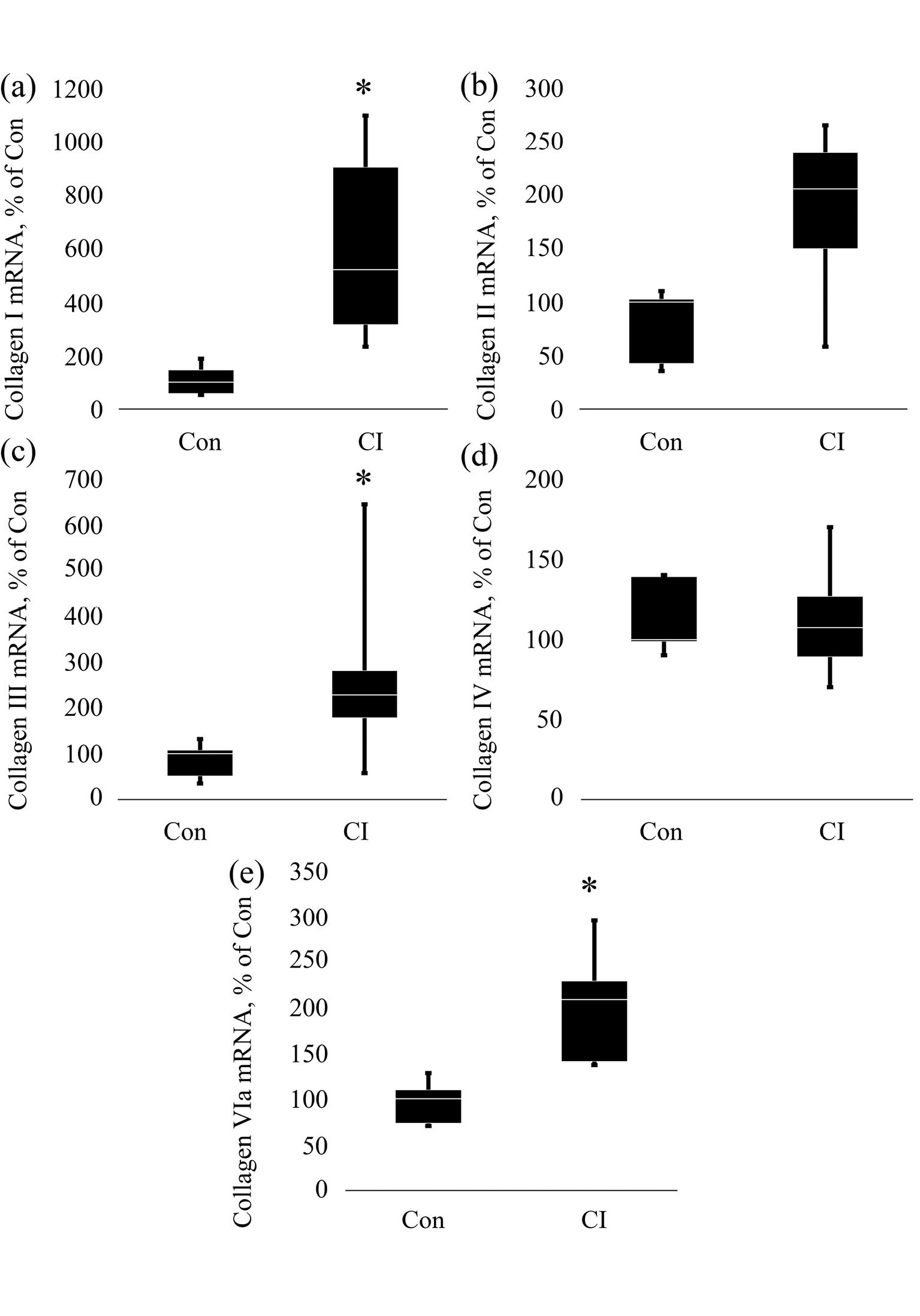 Рис. 3. Содержание мРНК коллагена I (a), коллагена II (b), коллагена III (c), коллагена IV (d), коллагена VIa (e). Con – здоровые люди, CI – критические состояния. * – достоверное отличие от Con (p < 0.05). Данные представлены в виде медианы и межквартильного интервала (0.25–0.75) ± минимальное и максимальное значения.