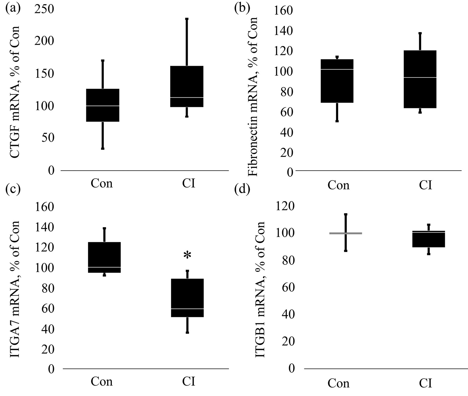Фактор роста соединительной ткани (CTGF) представляет собой белок, участвующий в различных критических биологических процессах, особенно во время эмбрионального развития, где он экспрессируется в высокой степени. Во взрослом возрасте экспрессия CTGF минимальна в большинстве тканей, однако его уровни повышаются при повреждении тканей и различных патологических состояниях [45–47]. Мы предположили, что фиброз скелетных мышц в условиях CIM связан именно с этим фактором роста. Однако мы не обнаружили увеличения экспрессии CTGF (рис. 4a). Кроме того, не было обнаружено изменения экспрессии мРНК другого важного белка ECM – фибронектина (рис. 5b).