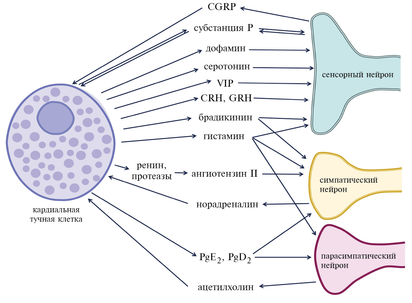 Локализация ТК вблизи кровеносных и лимфатических сосудов, в непосредственной близости от нервных окончаний предполагает двунаправленное посредничество между нервной и иммунной системами. Гистологическое исследование расположения ТК и нервных терминалей в сердце возрастных крыс [17, 20] показало, что расстояние между ними достаточное для осуществления паракринного взаимодействия [17]. Так, в правом предсердии крыс около 1% ТК находится на расстоянии менее 100 нм до нервных терминалей, около 13% ТК – на расстоянии от 101 до 500 нм. ТК обладают огромным разнообразием рецепторов на своей мембране, в том числе к нейромедиаторам, а также сами способны выделять сигнальные соединения: гистамин, серотонин, дофамин, нейропептиды VIP, кортикотропин-рилизинг гормон, гонадотропин-рилизинг гормон, NGF – взаимодействующие с рецепторами на нервных терминалях [17, 21]. Таким образом, активность ТК зависит от нервных влияний, и ТК сами могут влиять на работу нервных терминалей и нейронов в целом [17, 18, 21, 22].