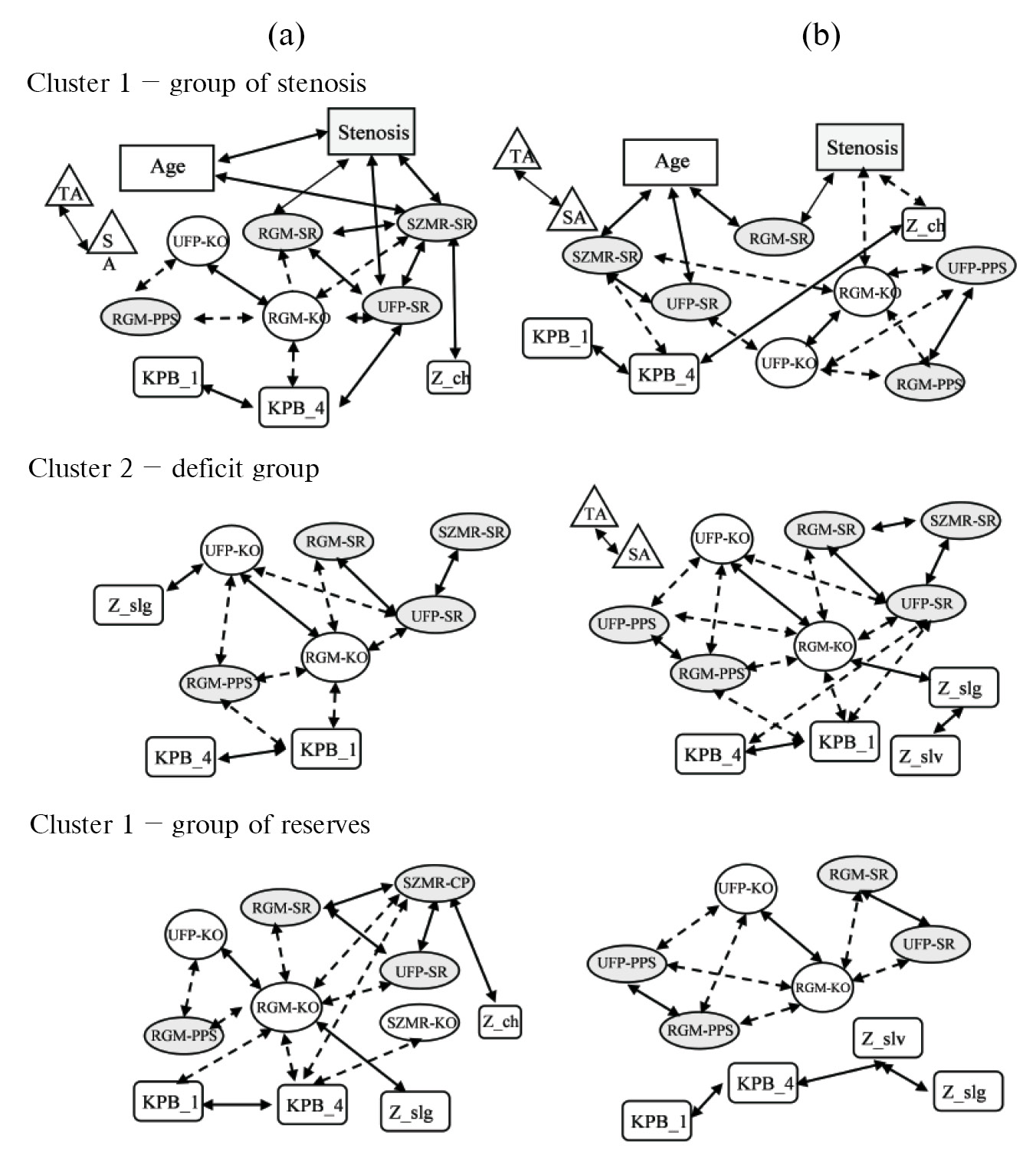 Рис. 3. Взаимосвязь исследованных параметров в трех кластерах, сформированных на основе дооперационных (a) и послеоперационных (b) данных пациентов со стабильной ИБС. Обозначения, как в табл. 2. Положительные корреляции обозначены сплошными линиями, негативные – пунктиром (0.00001 < p < 0.003 по критерию Спирмена).