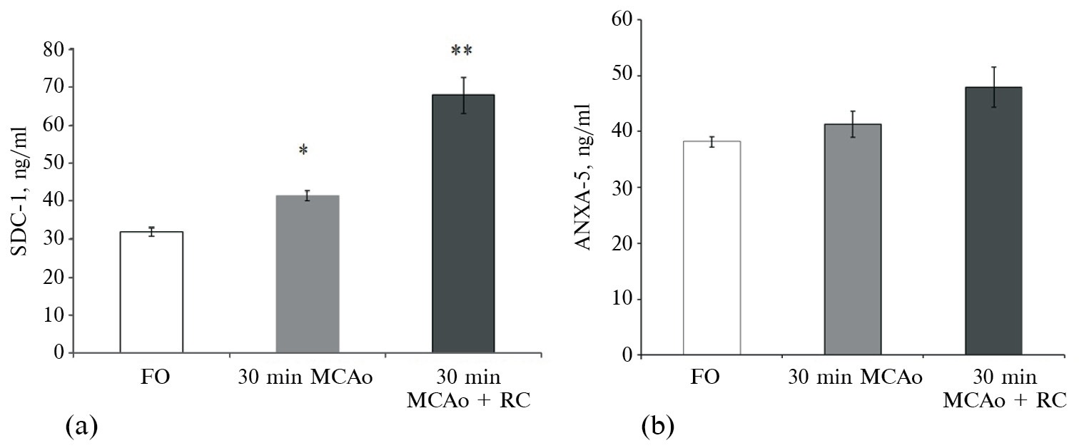 При определении концентрации SDC-1 в образцах плазмы крови животных группы 30 min МCАо разница с FO составила 30% (FO: 31.9 ± 1.1 ng/ml; 30 min МCАо: 41.4 ± ± 1.3 ng/ml, p < 0.05, рис. 2а). В образцах плазмы животных 30 min МCАо + RC концентрация SDC-1 превысила более чем в два раза (FO: 31.9 ± 1.1 ng/ml; 30 min МCАо: 67.8 ± ± 5.8 ng/ml, p < 0.01). В исследуемых группах не было выявлено разницы по содержанию в крови ANXA5 (рис. 2b).