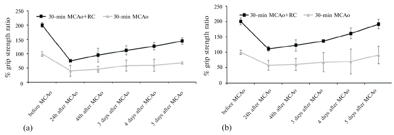 На пятые сутки после ишемии в группе животных 30 min МCАо мышечная сила в правой (контрлатеральной) передней конечности уменьшилась на 17% (FО: 5.2 ± 0.9 H; 30 min МCАо: 4.3 ± 0.2 Н, p > 0.5). На пятые сутки после ишемии в группе животных 30 min МCАо + RC мышечная сила в правой передней конечности составила 75% по сравнению с ложнооперированными животными (FО: 5.2 ± 0.9 H; 30 min МCАо + RC: 3.9 ± 0.8 Н, p > 0.5, рис. 3b).