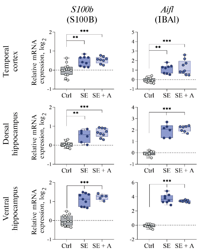 Уровень экспрессии мРНК S100b и Aif1 значимо возрос во всех исследованных структурах, и введение анакинры не снизило их гиперэкспрессию. В наших предыдущих исследованиях также было выявлено повышение экспрессии Gfap, являющегося классическим маркером активации астроглии [59]. В совокупности данные об экспрессии маркеров глиальных клеток позволяют сделать вывод о том, что на седьмые сутки после индуцированного пилокарпином эпилептического статуса наблюдается активация астроглиальных и микроглиальных клеток, что согласуется с литературными данными о нейровоспалении в период эпилептогенеза [60].