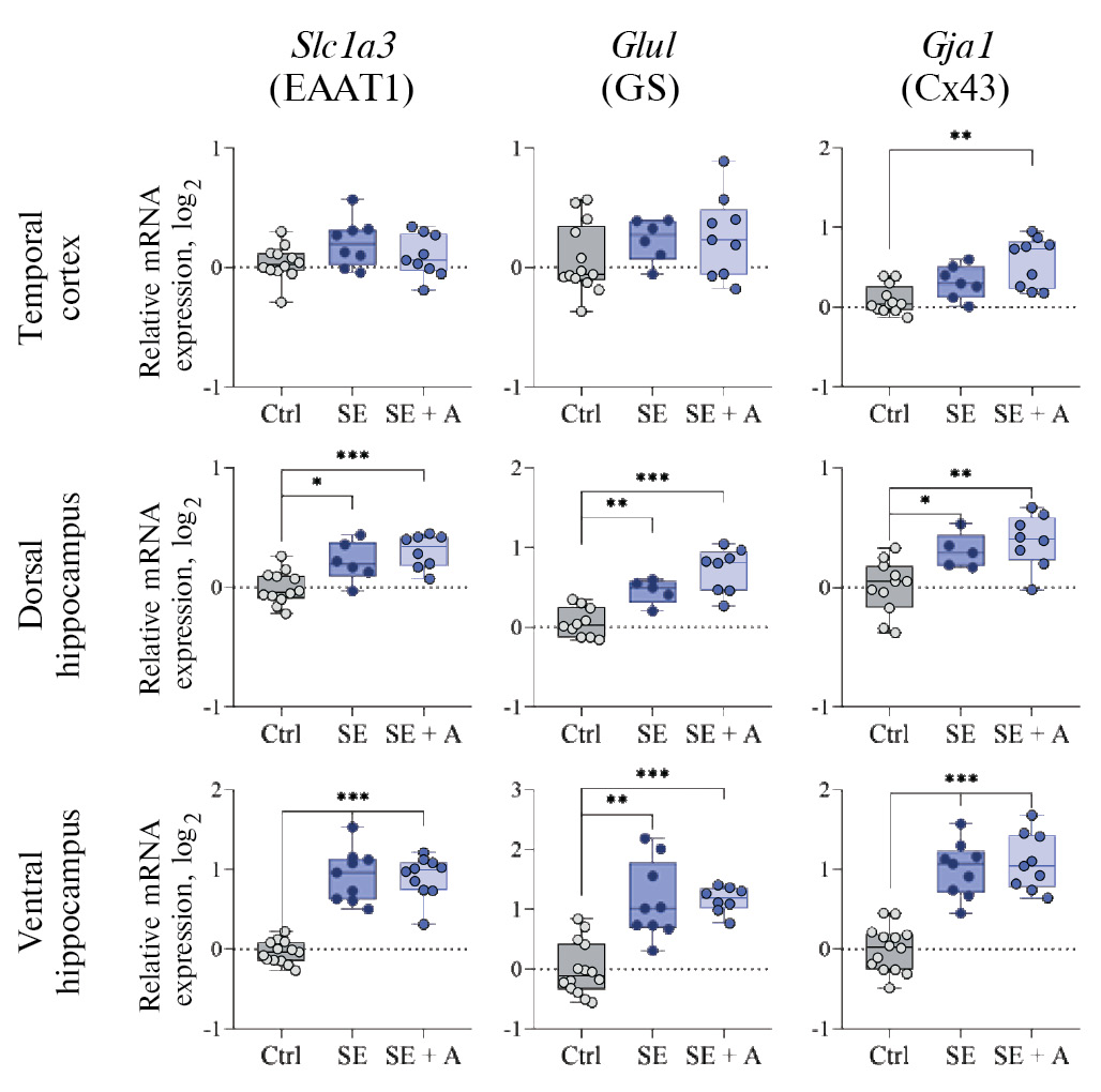 Кроме того, был проведен анализ экспрессии гена коннексина Cx43, участвующего в перераспределении глутамата между астроцитами [17]. Мы выявили повышение экспрессии гена Gja1 в дорзальной и вентральной областях гиппокампа через 7 дней после эпилептического статуса (рис. 2). В височной коре увеличение продукции мРНК гена Gja1 было обнаружено только в группе SE+A по сравнению с контрольными животными, но достоверной разницы между группами SE и SE+A выявлено не было. Полученные данные могут свидетельствовать о функциональной реорганизации астроцитарного синцития.