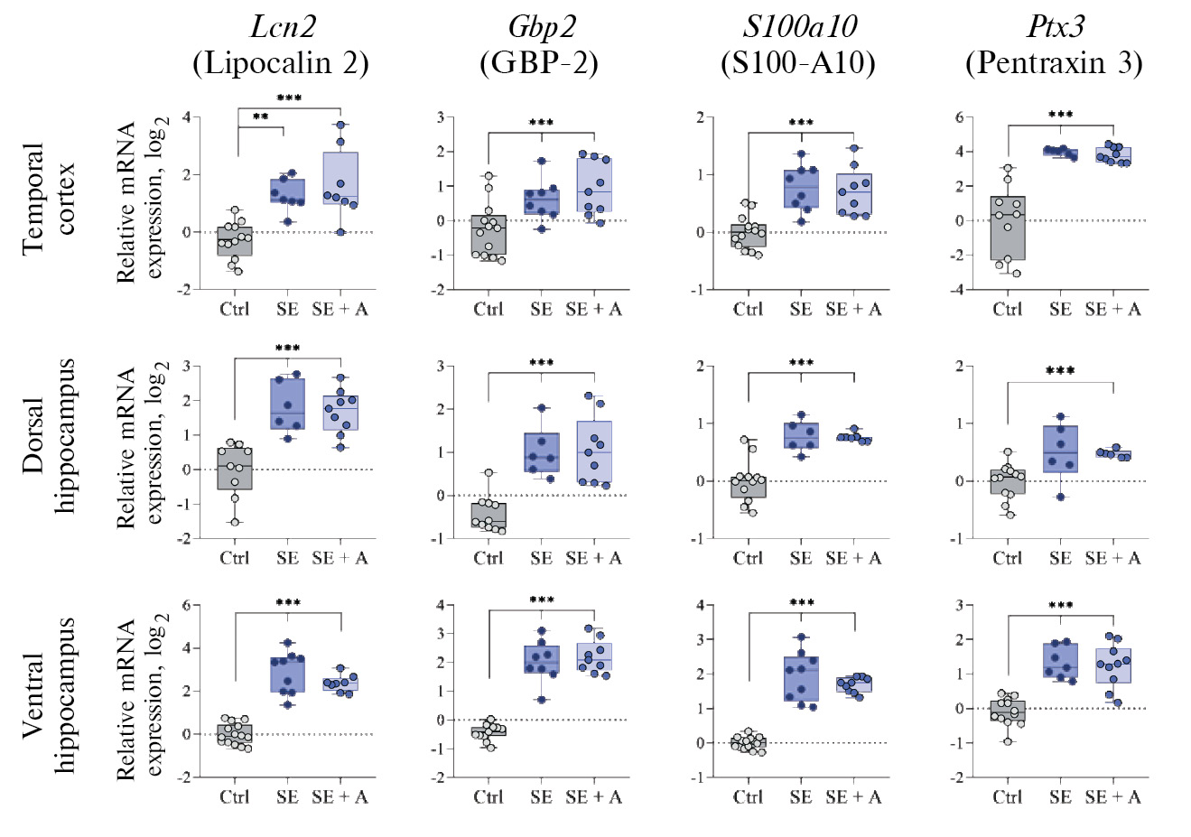 На основе анализа генов-маркеров А1/А2 поляризации астроцитов (Lcn2, Gbp2 и S100a10, Ptx3 соответственно) мы делаем вывод, что на седьмые сутки после SE имеет место активация обоих полярных состояний астроцитов. Более того, поскольку введение анакинры не оказало влияния на гиперэкспрессию изучаемых генов, мы предполагаем, что баланс этих состояний зависит не от активации пути IL-1β, а определяется другими механизмами.