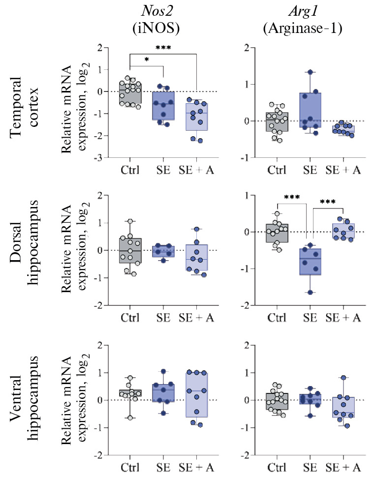 Эффективными маркерами полярных состояний активации микроглии являются ферменты, использующие аргинин в качестве субстрата, в частности, индуцибельная NO-синтаза (iNOS) и аргиназа-1 [9]. Для М1 характерно повышение продукции гена iNOS, синтезирующей NO, участвующий в реакциях окислительного стресса и нейровоспаления, имеющих место при эпилептогенезе [8, 9]. Мы оценили относительную экспрессию гена Nos2, кодирующего iNOS, и обнаружили снижение его продукции в височной коре, при этом применение анакинры способствовало более выраженному уменьшению экспрессии данного гена (рис. 5). Маркером состояния М2 является аргиназа-1, которая эффективно конкурирует с iNOS и превращает аргинин в орнитиновом цикле в орнитин и мочевину, что ведет к иммуносупрессии в связи с истощением содержания аргинина [10]. При анализе относительной экспрессии гена Arg1, кодирующего аргиназу-1, было выявлено снижение его экспрессии в дорзальном гиппокампе. Применение анакинры восстанавливало экспрессию данного гена до контрольных значений, что может указывать на смещение состояния активации микроглиальных клеток в сторону противовоспалительного фенотипа М2 (рис. 5).