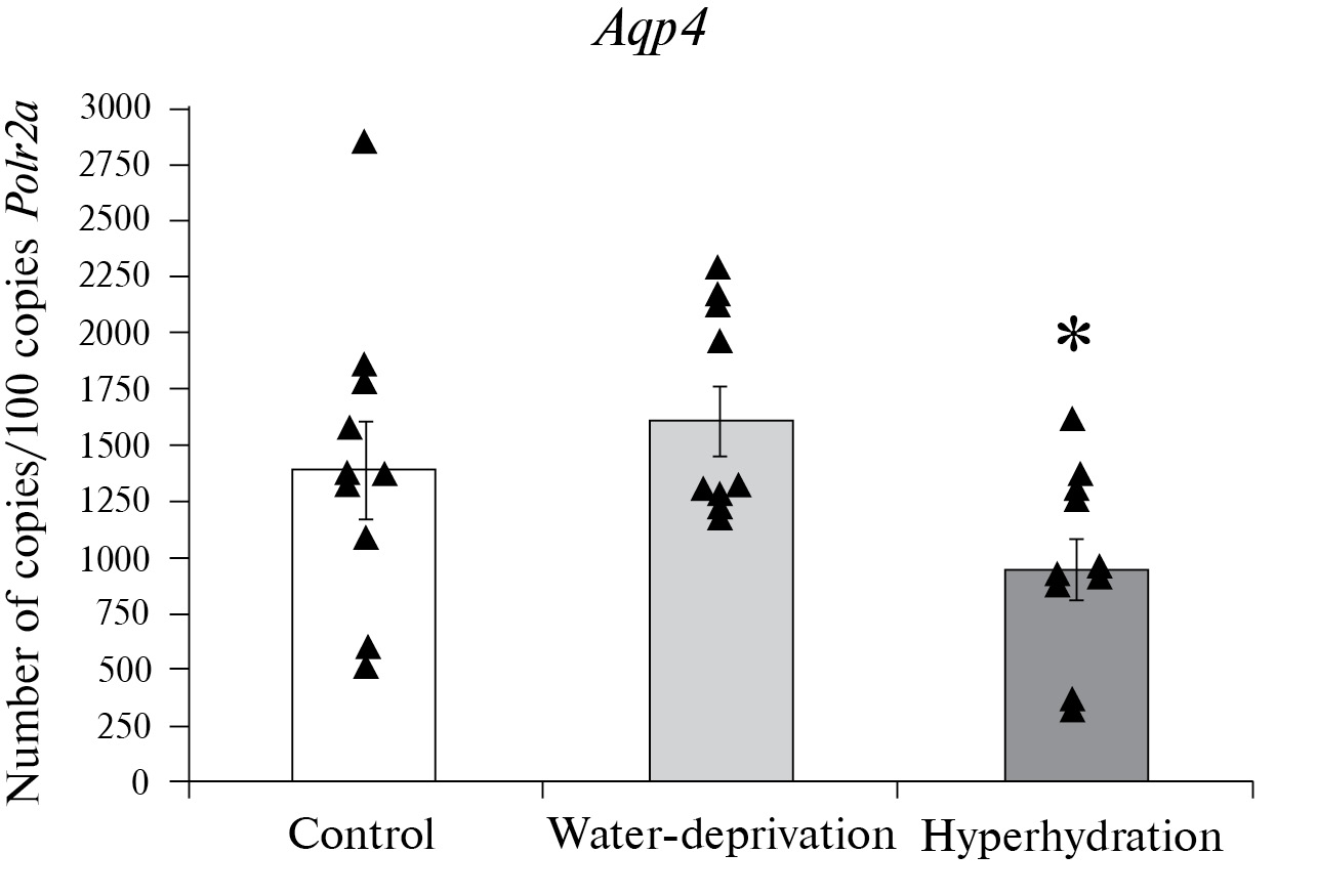 В обоих отделах гипоталамуса отмечается довольно высокий уровень экспрессии гена Aqp4, превышающий уровень экспрессии гена «домашнего хозяйства». Уровень мРНК Aqp4 в группах водной депривации и гипергидратации не отличался от контроля и составил: 1) для переднего отдела гипоталамуса 3996.2 ± 838.0, 4422.5 ± 823.9 и 2461.8 ± 449.3 копий/100 копий Polr2a (F1, 27 = 2.02, p = 0.68, p = 0.15) для групп контроля, водной депривации и гипергидратации соответственно. При сравнении уровня мРНК Aqp4 у животных контрастных групп достоверных различий обнаружено не было (F1, 27 = 2.02, p = 0.067); 2) для заднего отдела гипоталамуса – 1384.5 ± 209.6, 1600.3 ± 155.1, 943.9 ± 131.5 копий/100 копий Polr2a (F1, 26 = 3.86, p = 0.38, p = 0.07) для групп контроля, водной депривации и гипергидратации соответственно. Однако при сравнении уровня мРНК Aqp4 у животных контрастных групп обнаружено, что этот показатель в заднем отделе гипоталамуса у гипергидратированных животных более чем в 1.5 раза ниже (F1, 26 = 3.86, p = 0.012), чем у животных с водной депривацией (рис. 1).