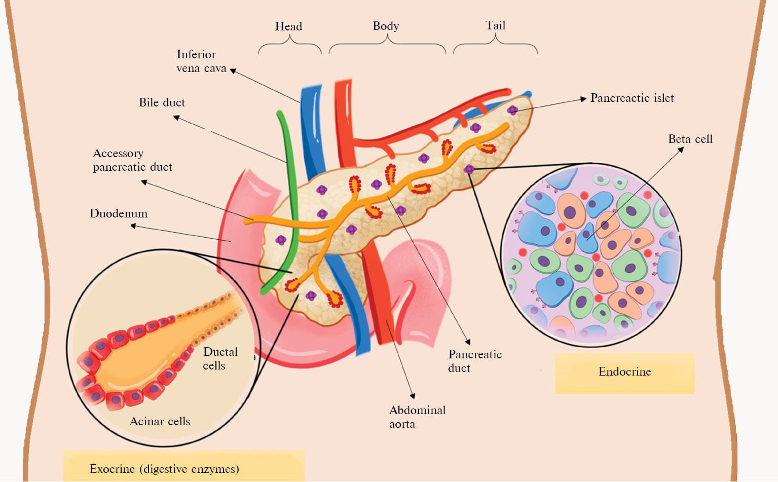 Обычно поджелудочную железу разделяют на две дискретные системы: эндокринную и экзокринную. Эндокринная часть состоит из островков Лангерганса, отдельных единиц эндокринных клеток и их зачатков, тогда как экзокринная часть состоит из ацинарных клеток и системы протоков. Экзокринная часть выделяет слабощелочной сок с пищеварительными ферментами, направленными в двенадцатиперстную кишку, а эндокринная вырабатывает гормоны и высвобождает их в кровь. Однако недавние исследования показывают, что эти два объекта поджелудочной железы имеют сильную взаимную связь между собой [10]. Всем специалистам, занимающимся проблемами поджелудочной железы, необходимо иметь глубокое понимание функции обеих частей поджелудочной железы, а также анатомических и функциональных взаимосвязей между ними, чтобы разрабатывать новые методы лечения с новыми биологическими мишенями для лечения, в частности.